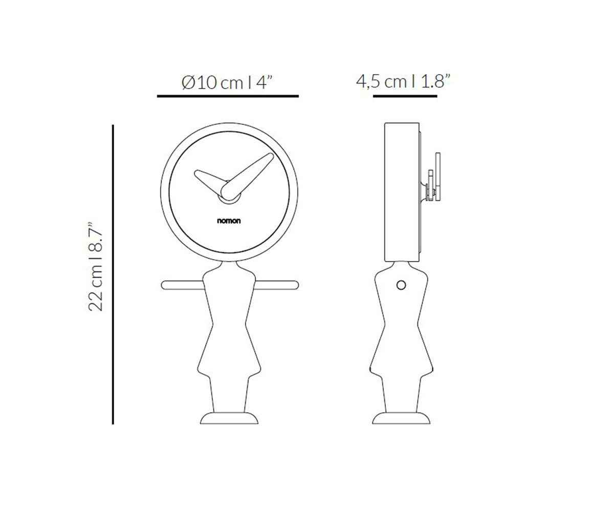 Table Clock Nena is a designer decoration that combines the function of timekeeping with a sculptural form. This unique clock stands out with a silhouette inspired by the brand's symbolic figures and a careful combination of solid walnut or ash wood finished in oak with elegant metal details. Thanks to its refined form, the modern table clock looks perfect on a dresser, console, or coffee table, bringing warmth and sophisticated style to the interior.