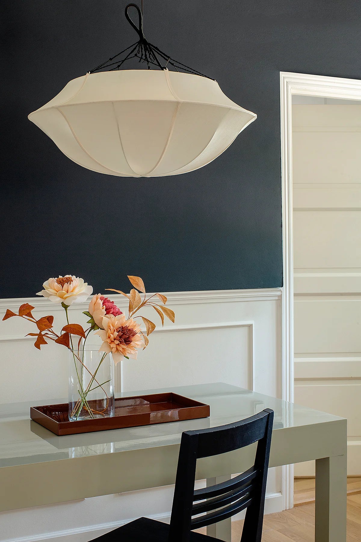 Abažúr Umbrella značky Oi Soi Oi je návrh, ktorý očarí jemnou eleganciou a výnimočnou ľahkosťou. Vyrobený na 100% z prírodného hodvábu s bavlnenou stuhou, vyniká jedinečnou formou pripomínajúcou rozložený dáždnik. Abažúr vyžaruje príjemné, mäkké svetlo, ktoré vytvára vo vnútornom priestore atmosféru tepla a pokoja – ideálnu do obývačky, spálne alebo jedálne.
