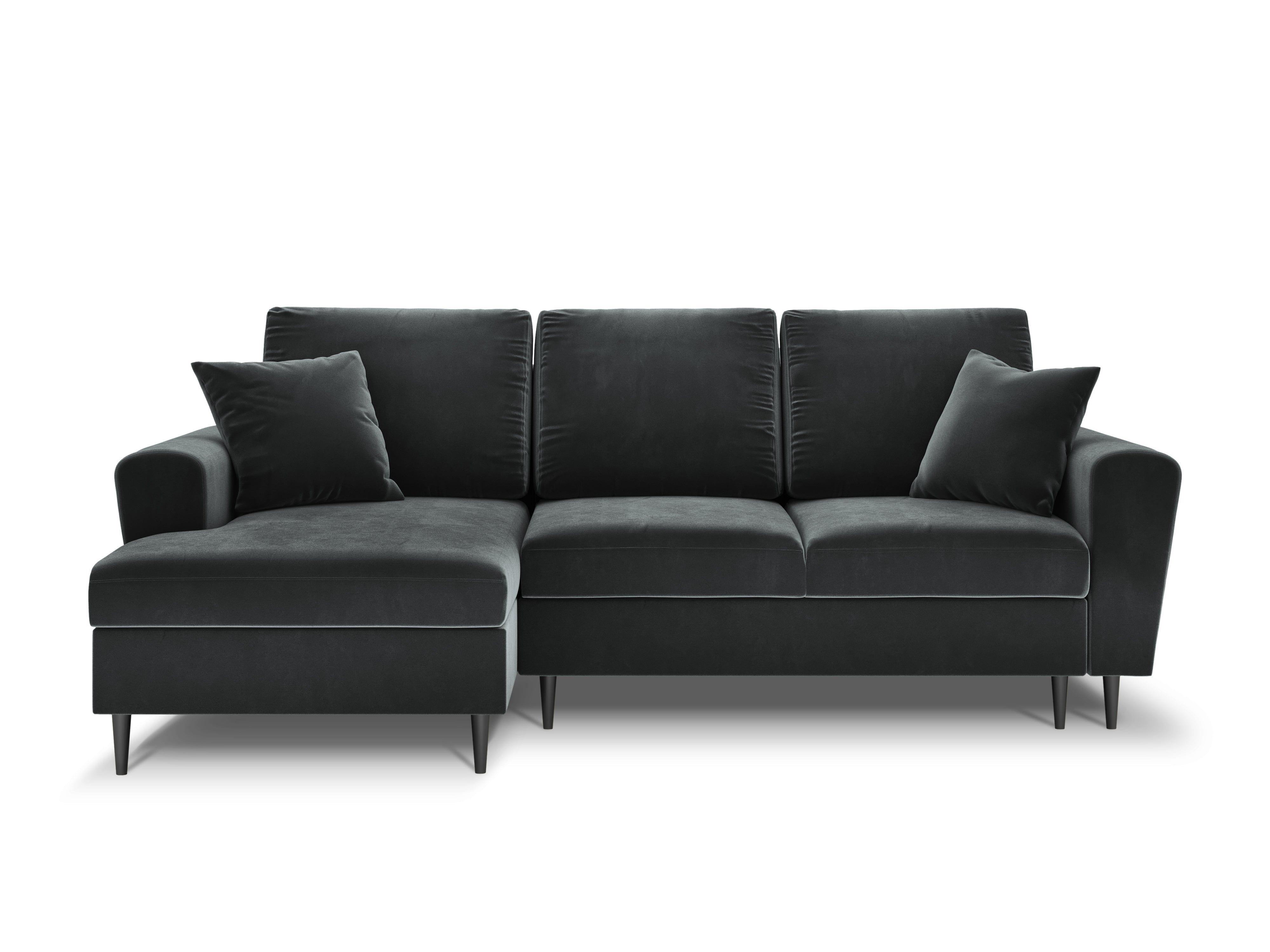 Ľavostranný sametový rohový gauč s funkciou spania KYOTO tmavosivý s čiernym podstavcom
