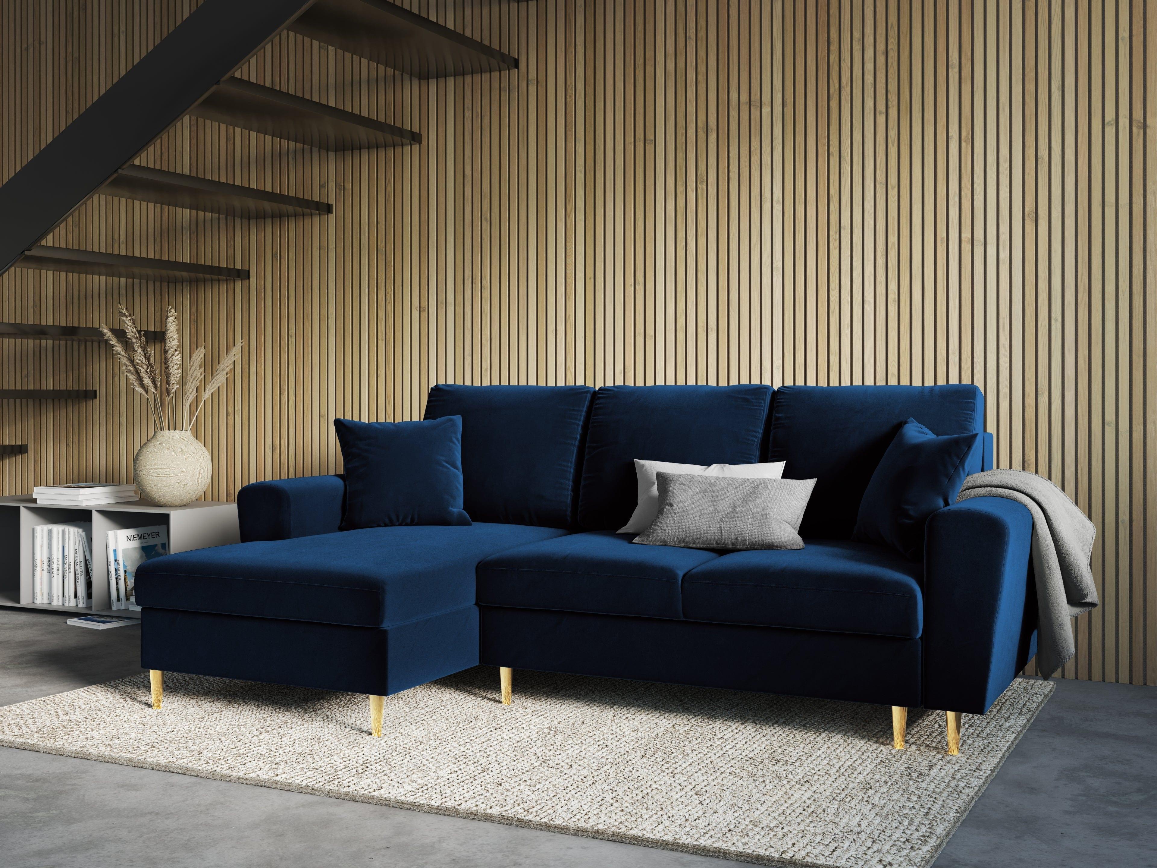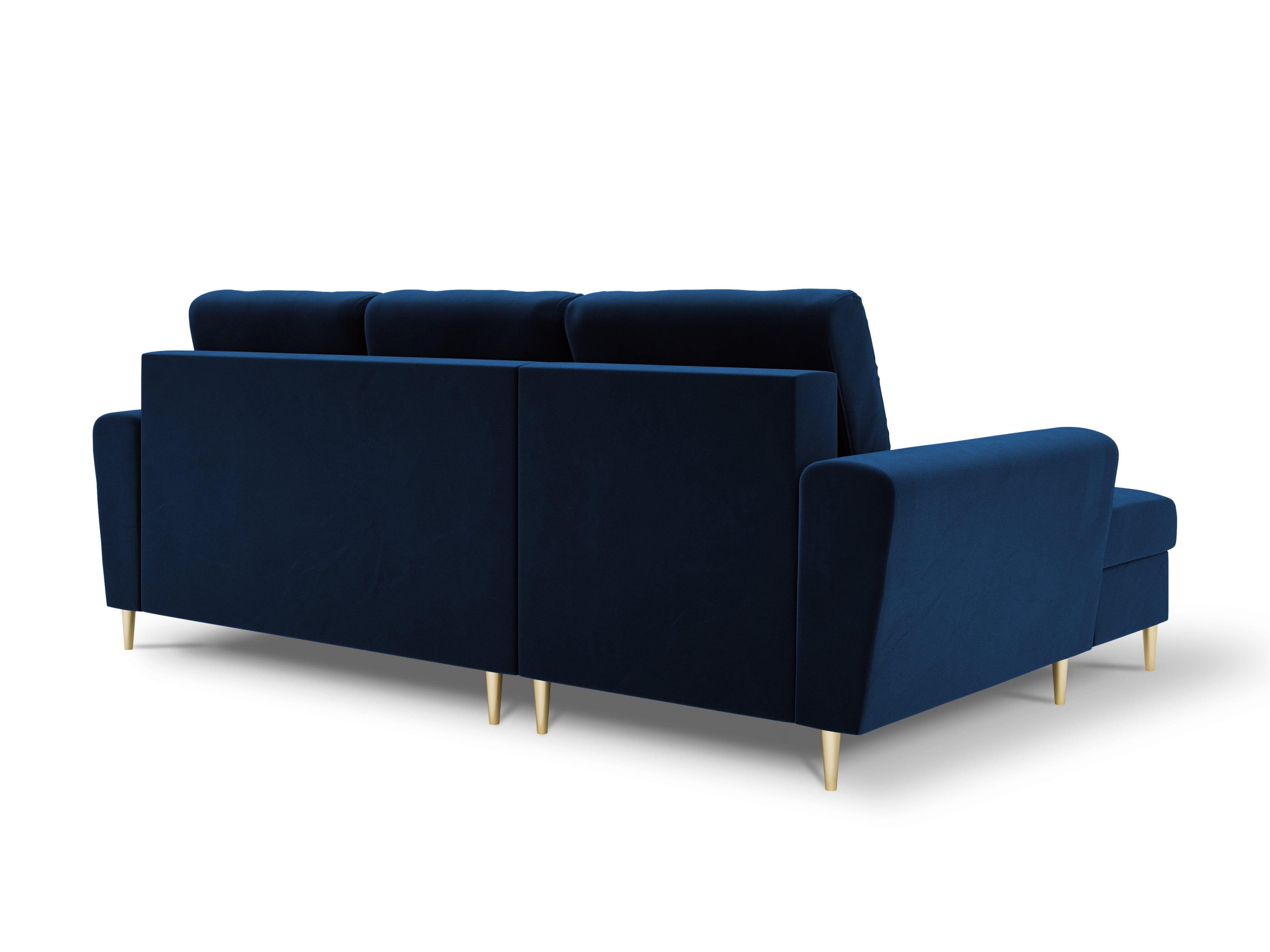 Narożnik lewostronny aksamitny z funkcją spania KYOTO niebieski ze złotą podstawą