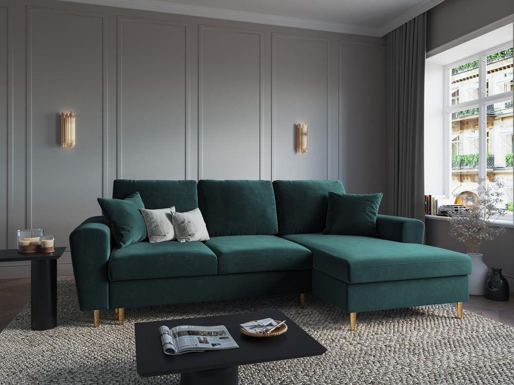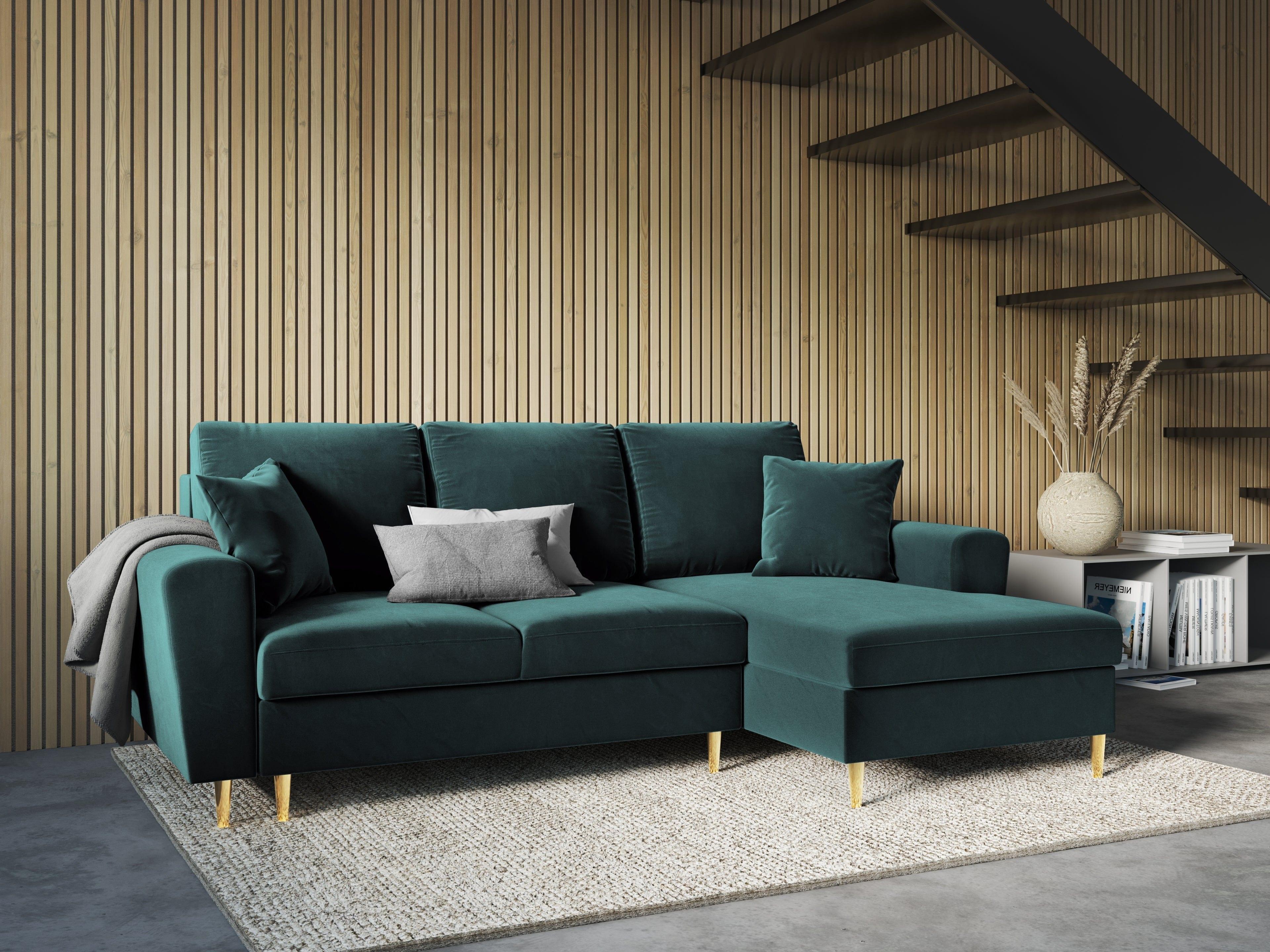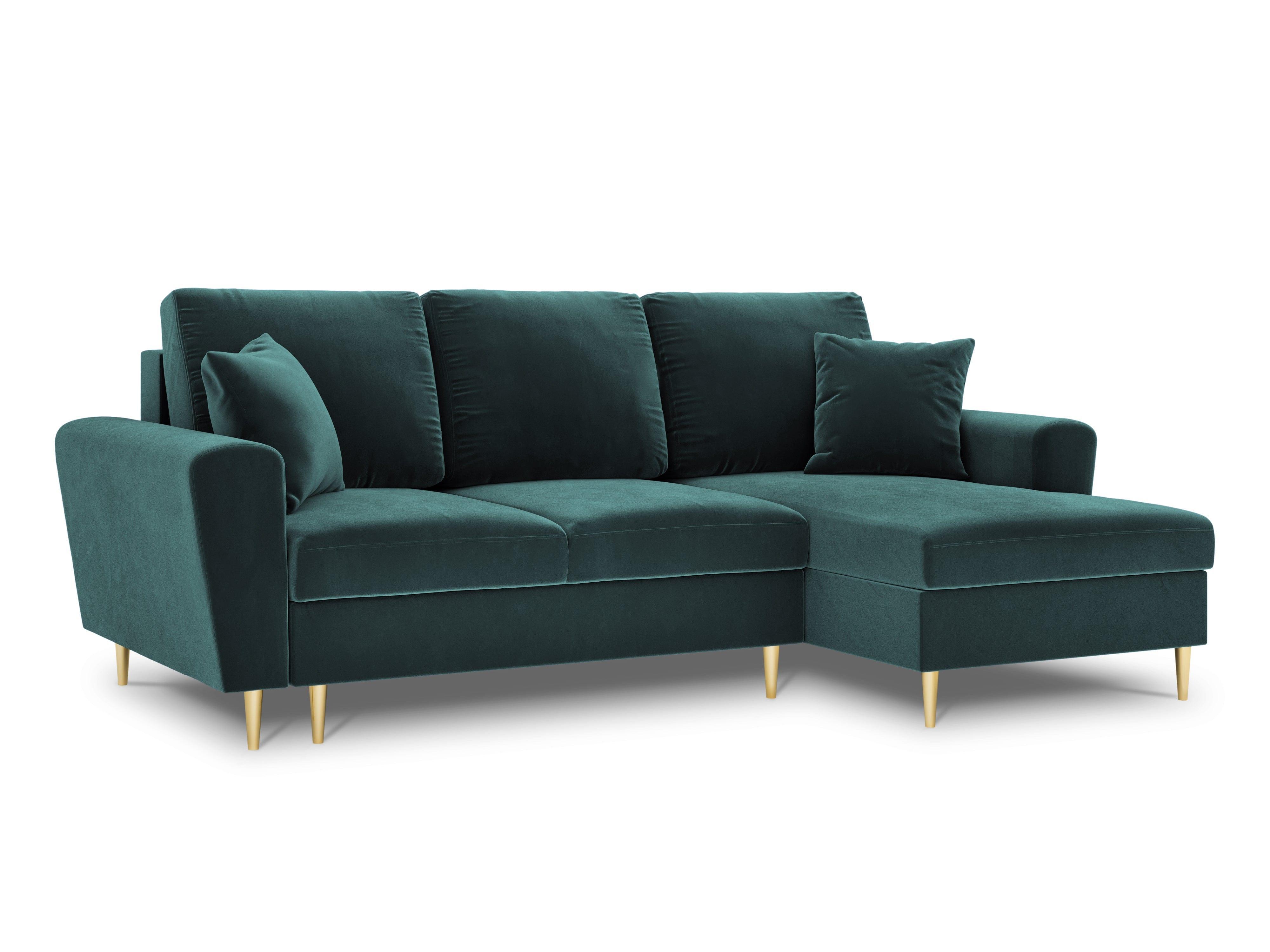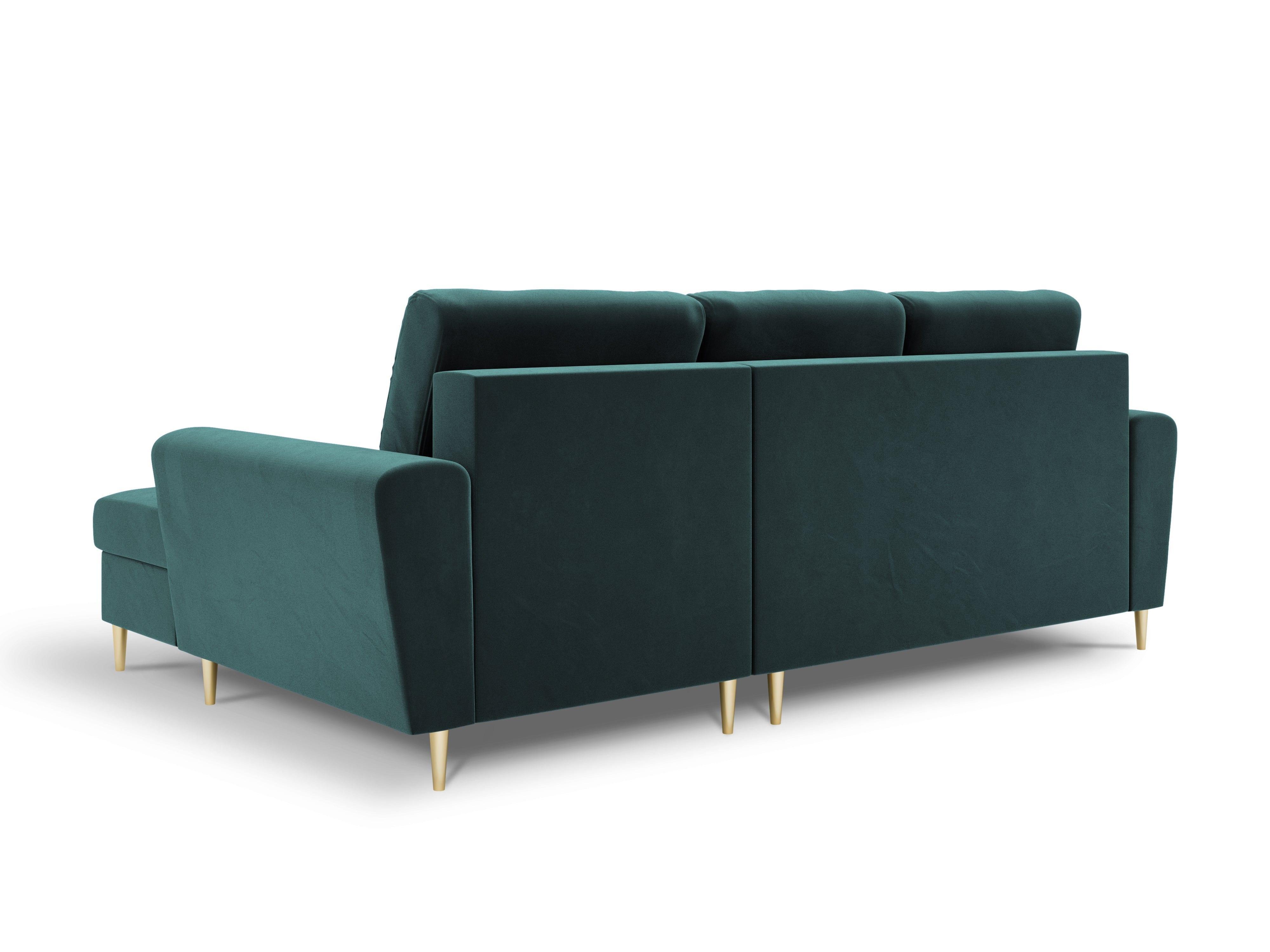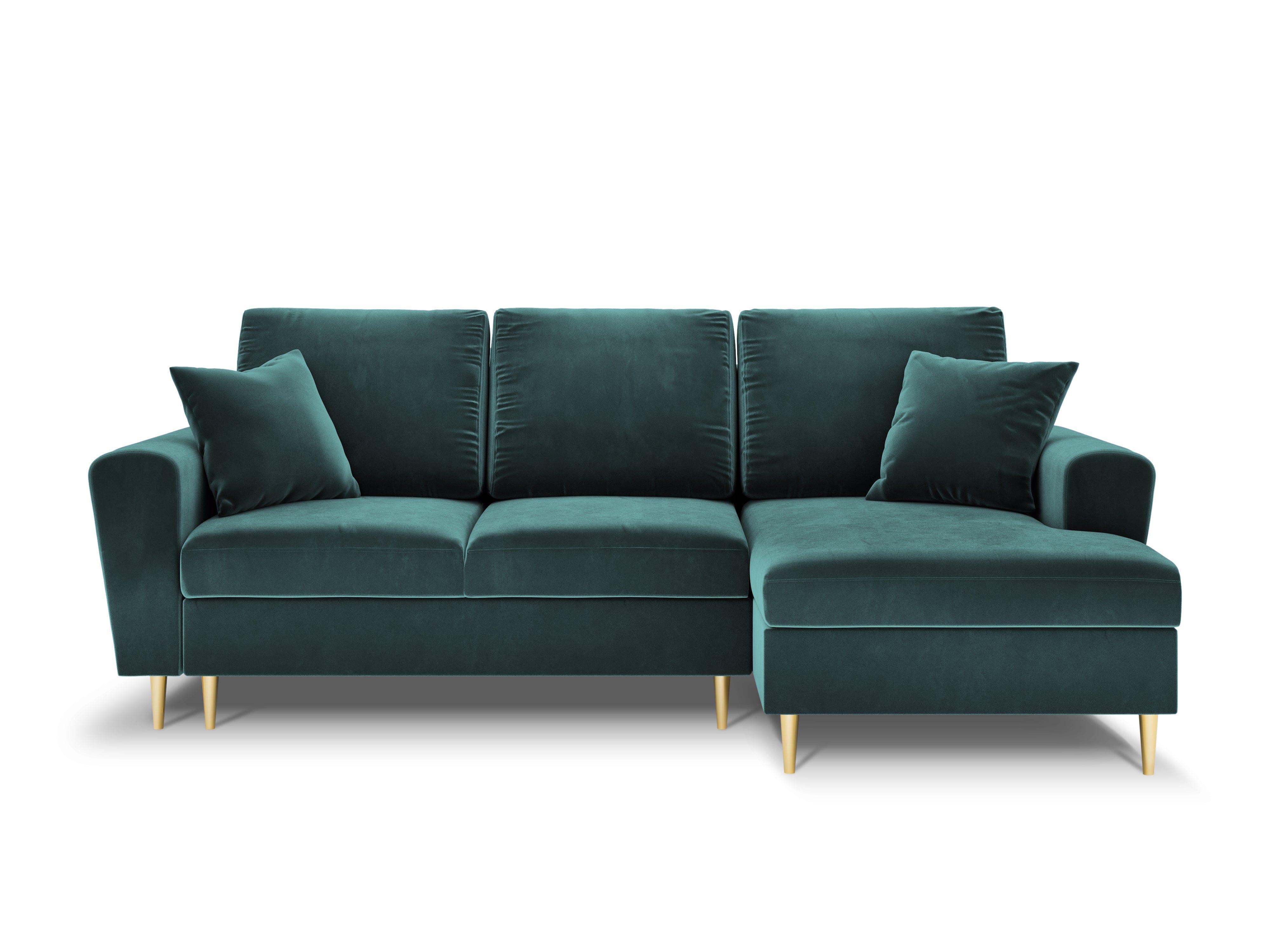 Pravostranný sametový rohový gauč s funkciou spania KYOTO petrol so zlatým podstavcom
