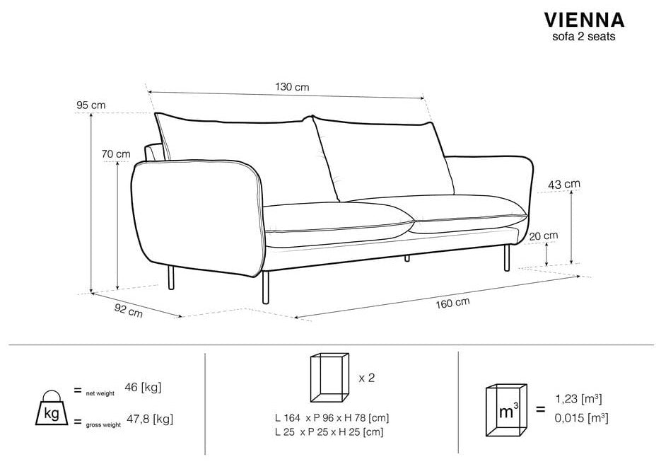 Sofę Vienna wyróżniają piękne proporcje i harmonijne kształty. Sofa do salonu jest nie tylko wygodna, ale też wprowadzi do wnętrza nutę paryskiego szyku i elegancji. Subtelny kształt i miękkie siedzisko zapewnią niezwykły komfort użytkowania. Metalowe nogi nadają całej formie lekkości.