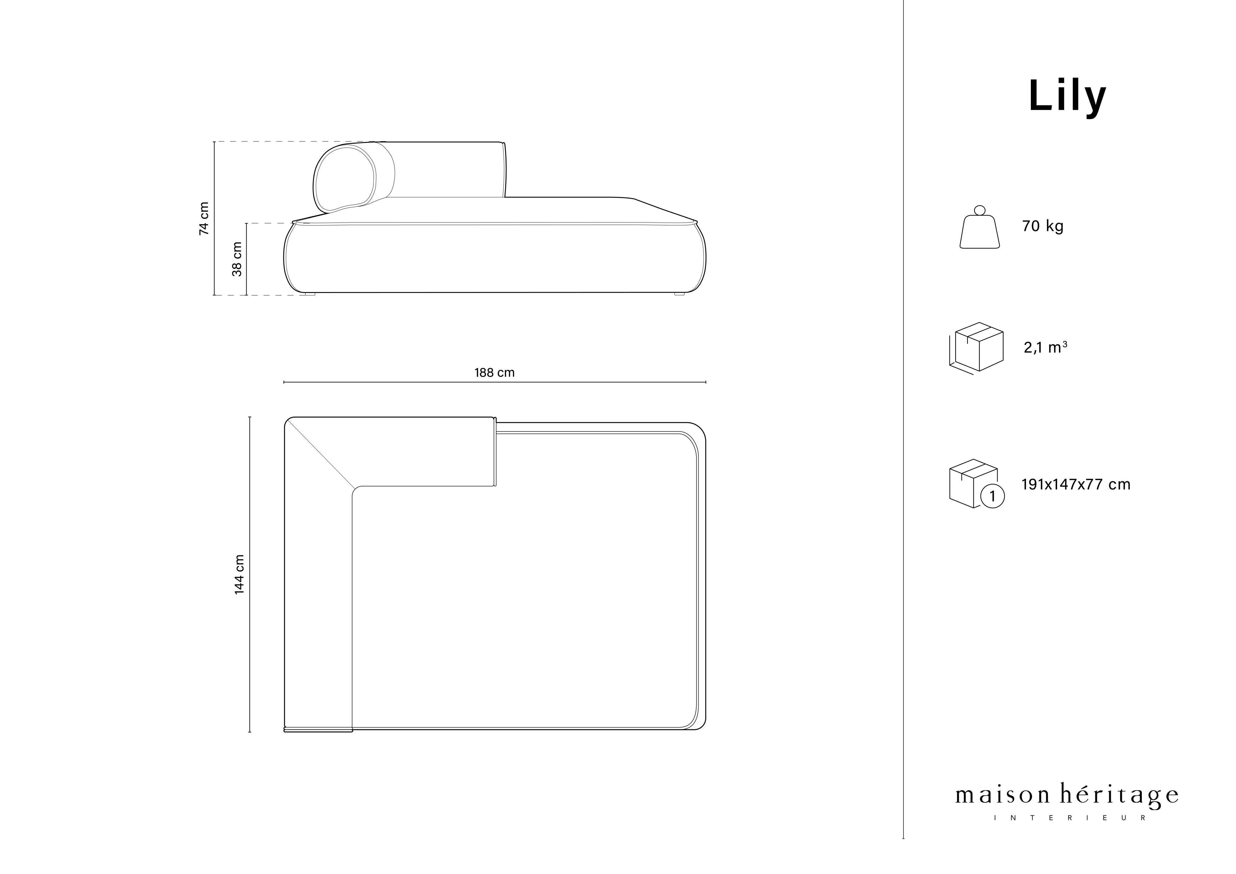 Hlboké sedadlá sú pružné a mimoriadne pohodlné. Jemné prešívanie a prešívané detaily zdôrazňujú klasický charakter dizajnu. Vďaka nízkej a rozložitej siluete szezlong Lily prinesie do interiéru kúsok útulnosti a tepla. V kolekcii sú k dispozícii rôzne kombinácie pohoviek a rohových sedacích súprav, ako aj szezlong a veľká pufa, vďaka ktorým môžete vytvoriť jedinečný interiér.
