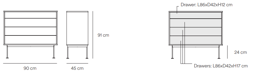 Celok dopĺňa kovová konštrukcia nôh, ktorá je v tej istej farbe ako horná zásuvka — takto dizajnéri španielskej značky Teulat dbali na súlad prvkov. Komoda Yoko bude ideálnym riešením do obývačky, spálne alebo predsiene.