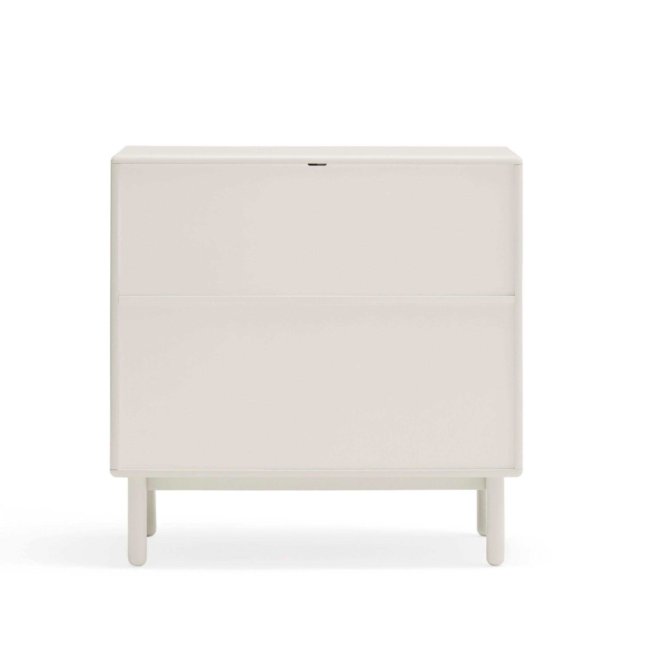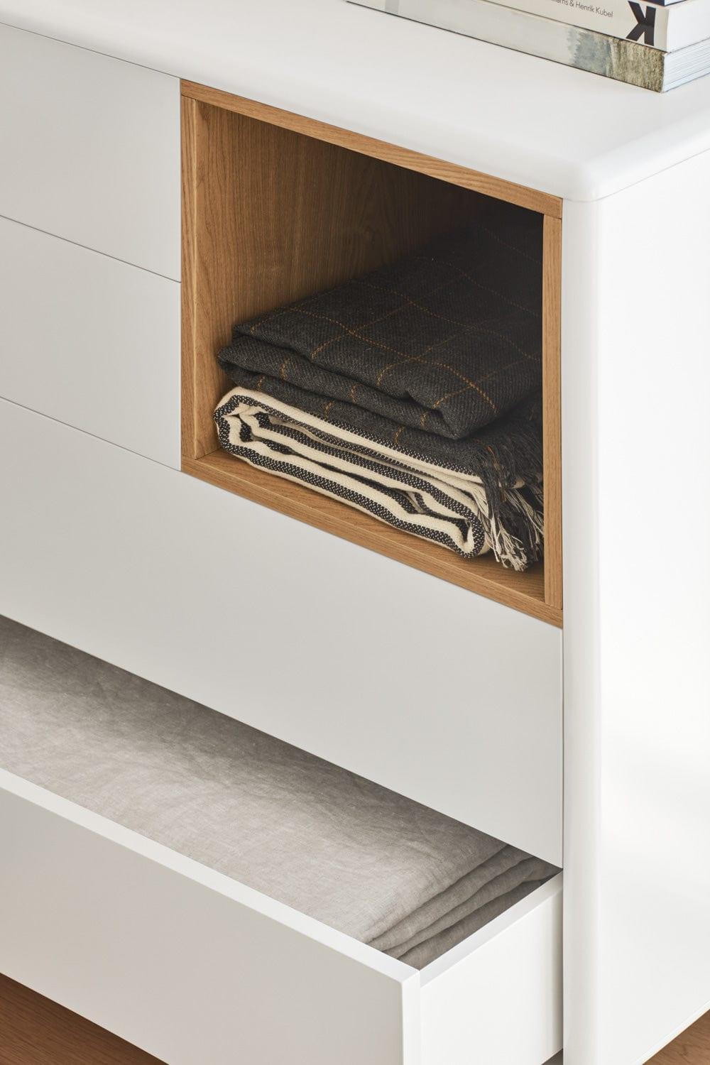 Zastosowanie zamykanych szuflad sprawia, że Corvo jest nie tylko estetycznym dodatkiem, ale również praktycznym meblem. Drewniane detale, które wyróżniają się na tle kremowego koloru, podkreślają charakter szafki oraz dodają jej przytulności.