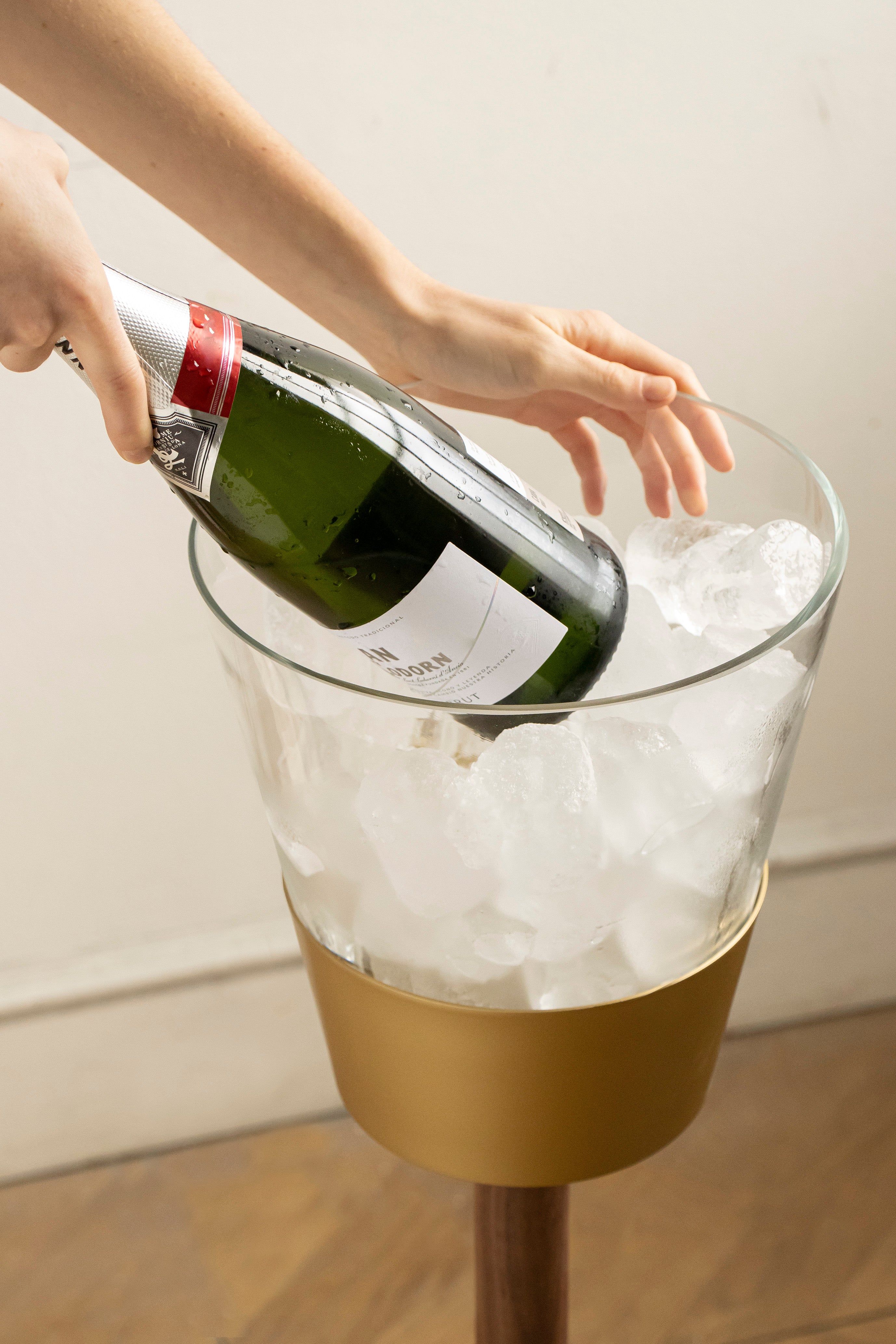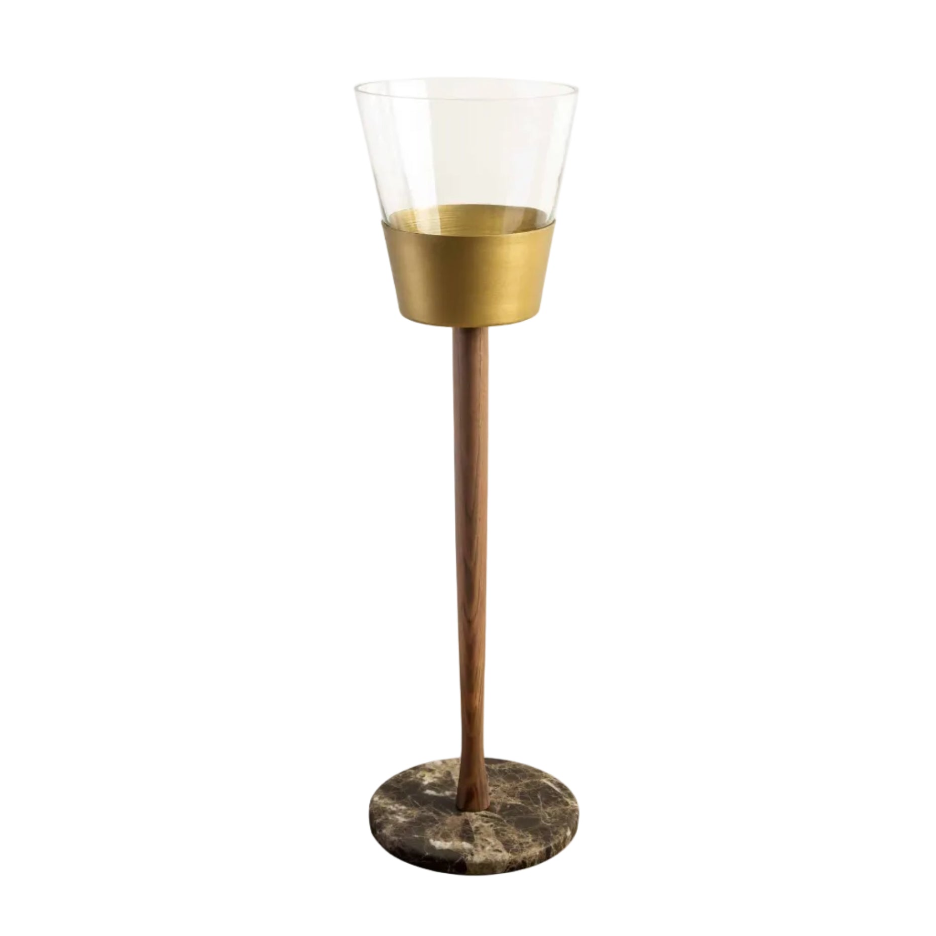 Sklenený vedro na ľad je usadené v anodizovanom hliníkovom pohári, podopretom na štíhlej nohe z masívneho orecha. Stabilná mramorová základňa dodáva konštrukcii vznešenosť a trvácnosť. To je exkluzívny chladič na šampanské na stojane, ktorý spája mramor, drevo a kov v harmonickej, modernej kompozícii. Ideálny ako stojaci chladič na víno a šampanské počas osláv, večerí a výnimočných príležitostí.