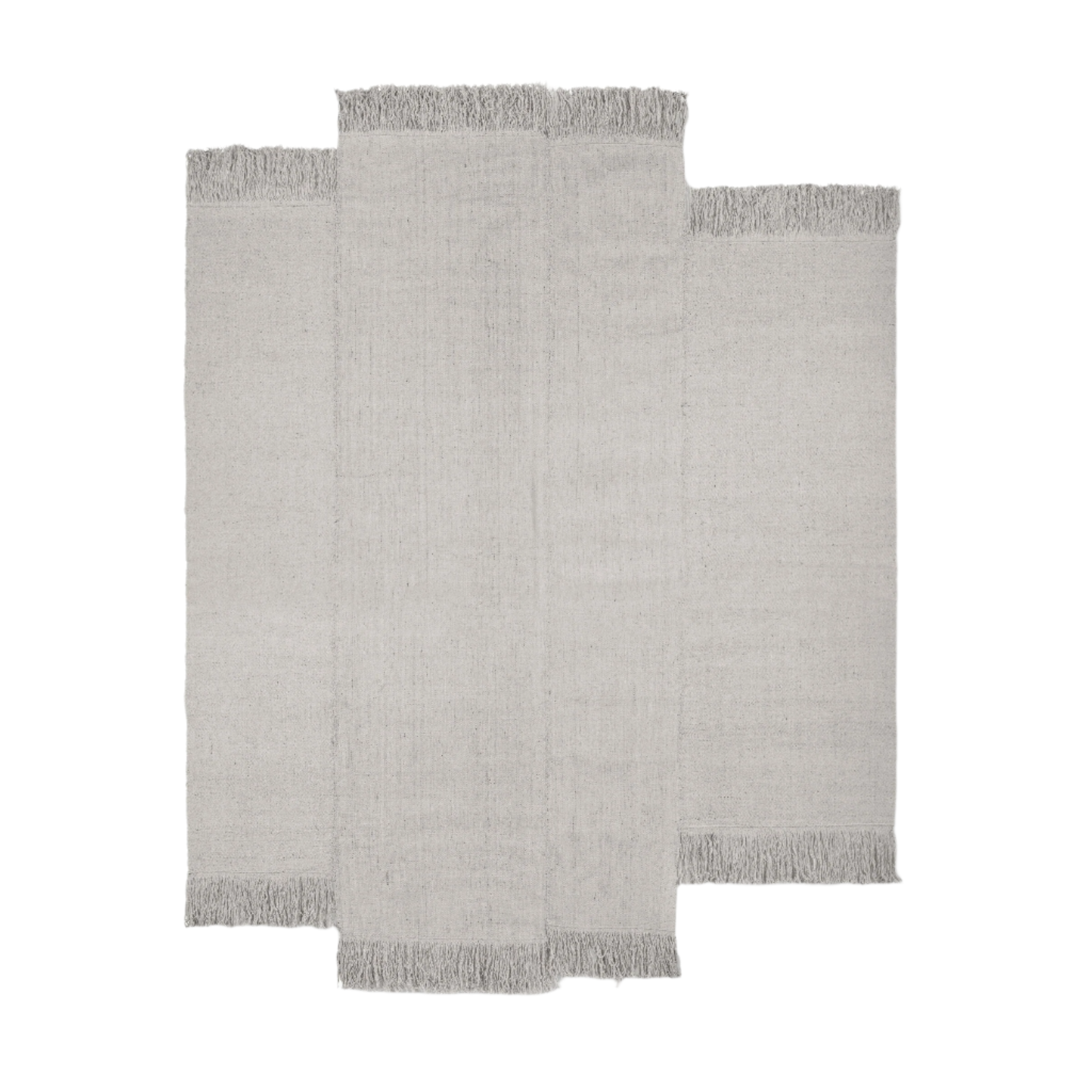 Dywan Alter zachwyca niepowtarzalną formą i naturalną estetyką, stanowiąc elegancki akcent w każdej przestrzeni. Wykonany ręcznie z naturalnej, niebarwionej wełny, złożony z ukośnie zszywanych paneli, tworzy niebanalny, geometryczny układ, który przyciąga wzrok i dodaje wnętrzu wyjątkowego charakteru. Długie, nieregularne frędzle po bokach nadają całości lekkości i dynamiki.