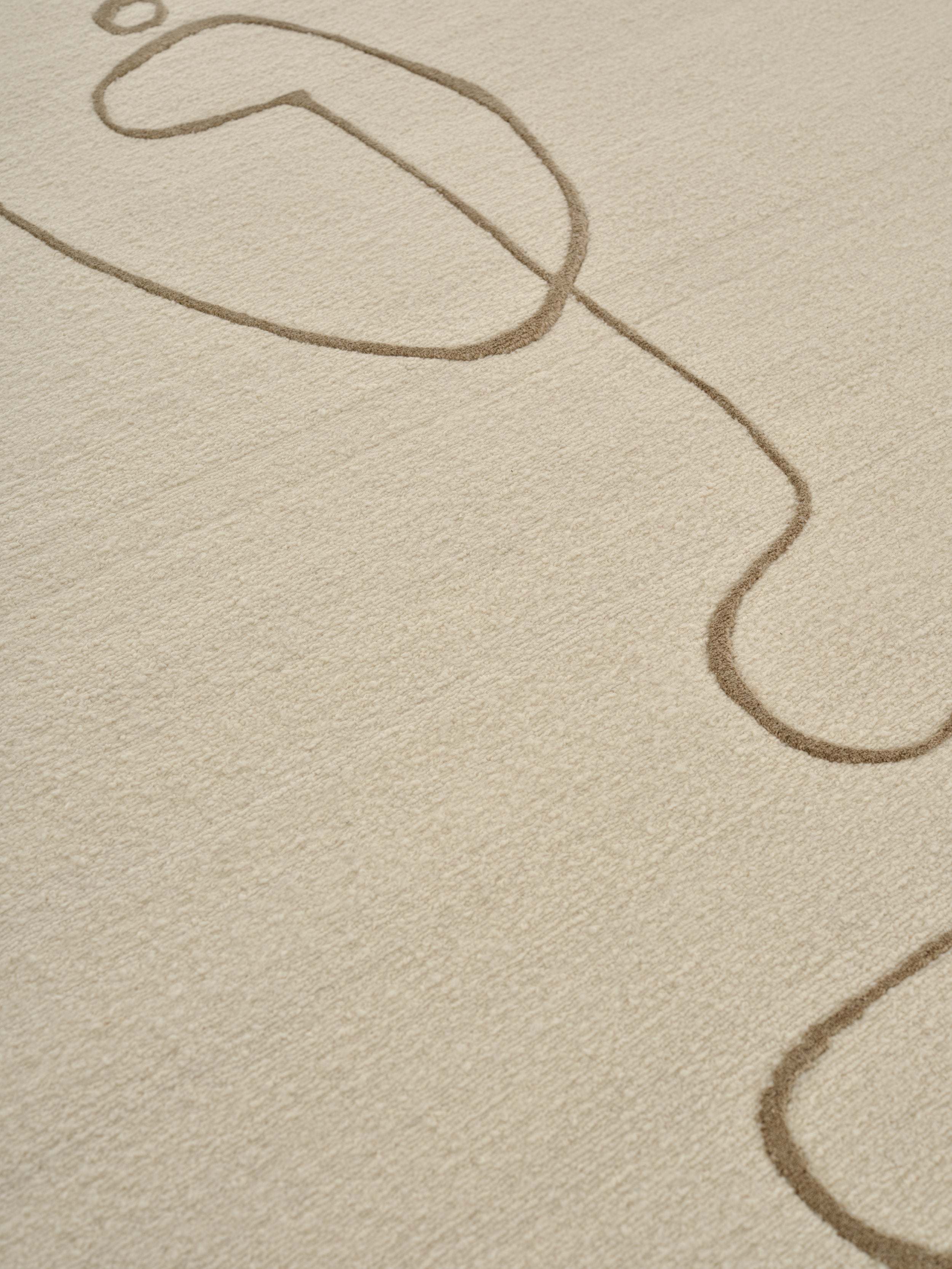 Koberec Facial Maze je kompozícia, ktorá spája mäkkú štruktúru s výrazným, lineárnym vzorom. Prebiehajúca cez celok, nekončiaca línia z ľanu kontrastuje textúrou s jemnou vlnou, čím vytvára dynamický a zároveň harmonizovaný vizuálny dojem. Je to návrh pre tých, ktorí hľadajú v svojom interiéri subtílnu expresiu a precízny detail. Koberec nielenže zdobí, ale tiež ponúka príjemné teplo a komfort pri používaní.