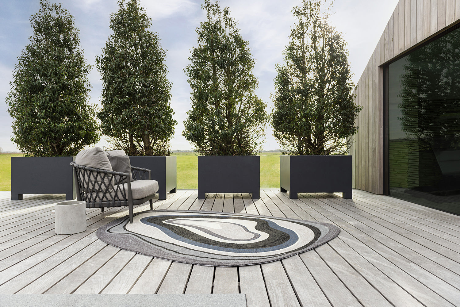 Vyrobený na 100% z polyesteru, koberec sa vyznačuje vysokou odolnosťou voči poveternostným podmienkam – je odolný voči vlhkosti, UV žiareniu a znečisteniu. Vďaka tomu je ideálny na terasu, balkón alebo do záhrady, pričom do nich vnáša eleganciu a pohodlie. Ručné tuftovanie zabezpečuje vysokú kvalitu a trvácnosť, a hrúbka 1,1 cm robí koberec ľahko udržiavateľným a rýchlo schne po namočení.