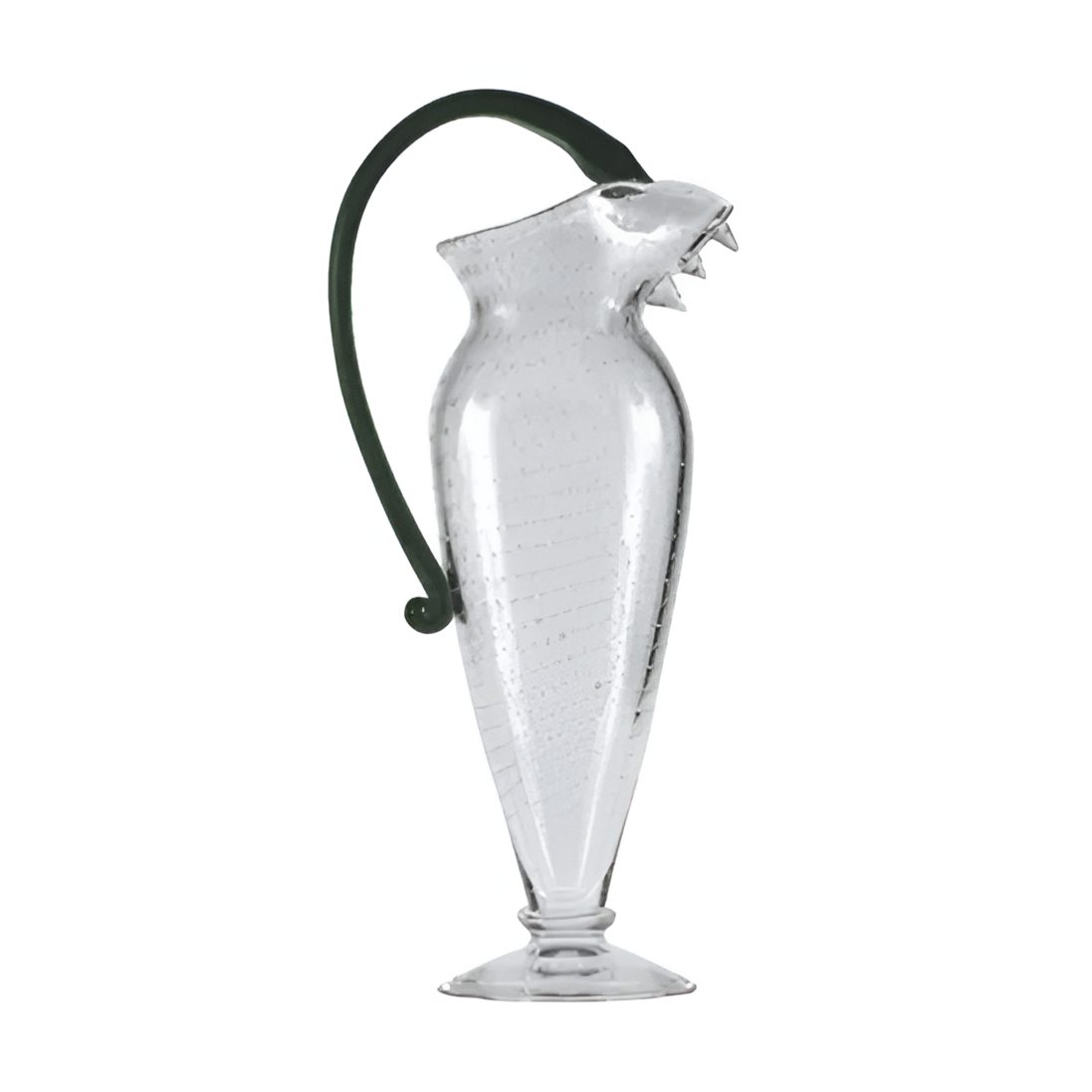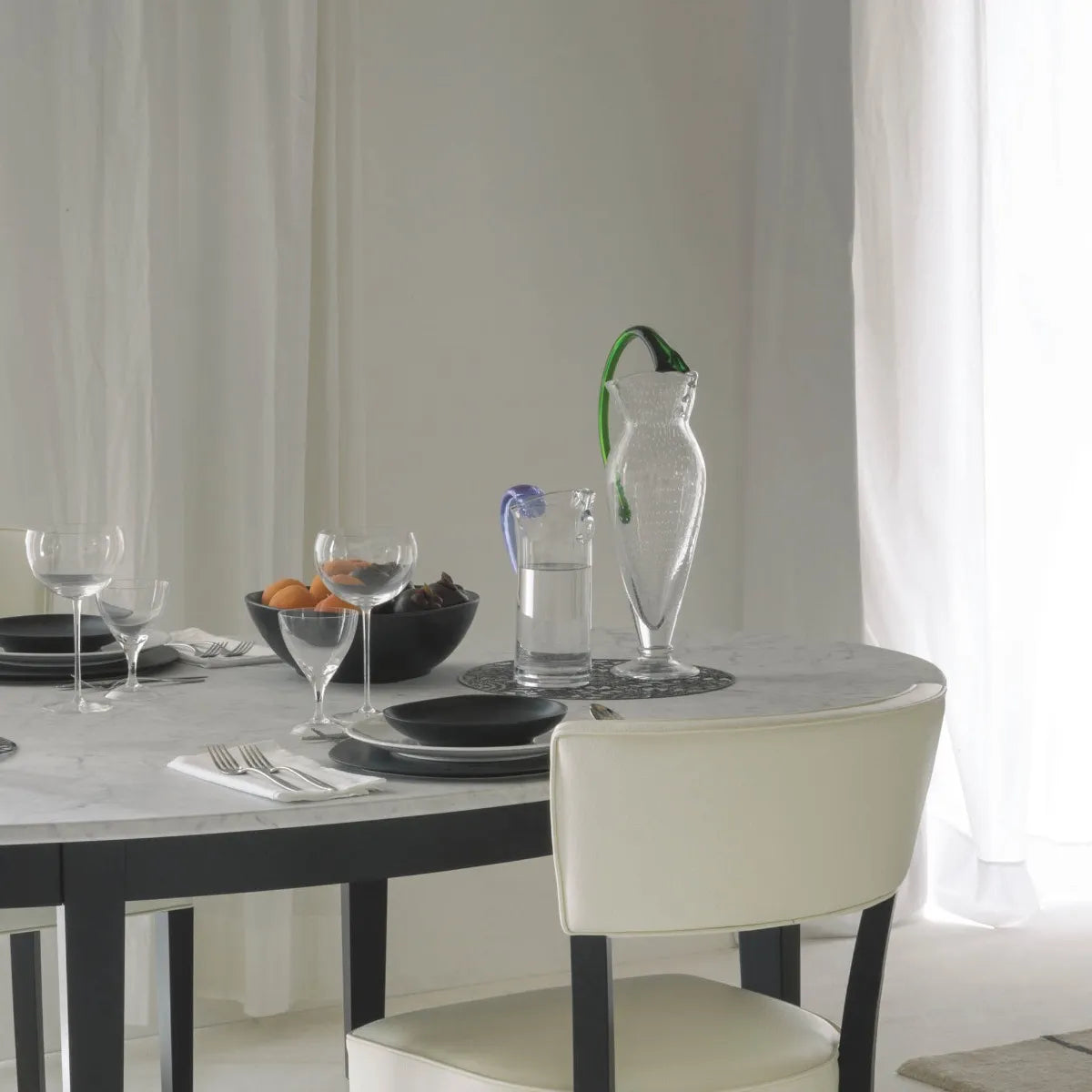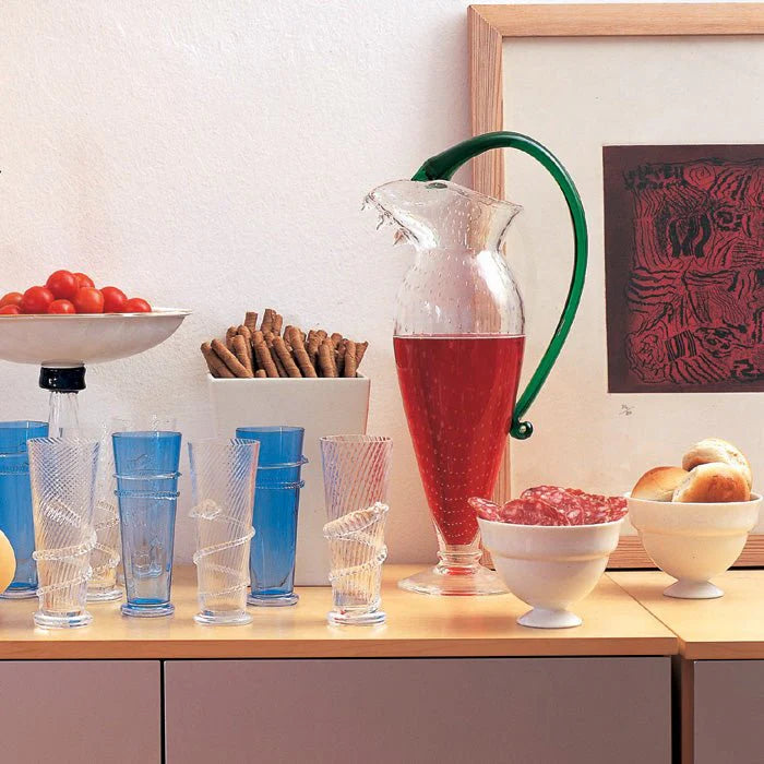 Vyrobená z priehľadného a zeleného fúkaného skla, Vichy spája ľahkosť materiálu s expresívnym tvarom. Tento nádoby nie sú len na servírovanie vody, ale predovšetkým výnimočný dekoratívny prvok, ktorý pridá umelecký charakter každému stolu alebo interiéru.