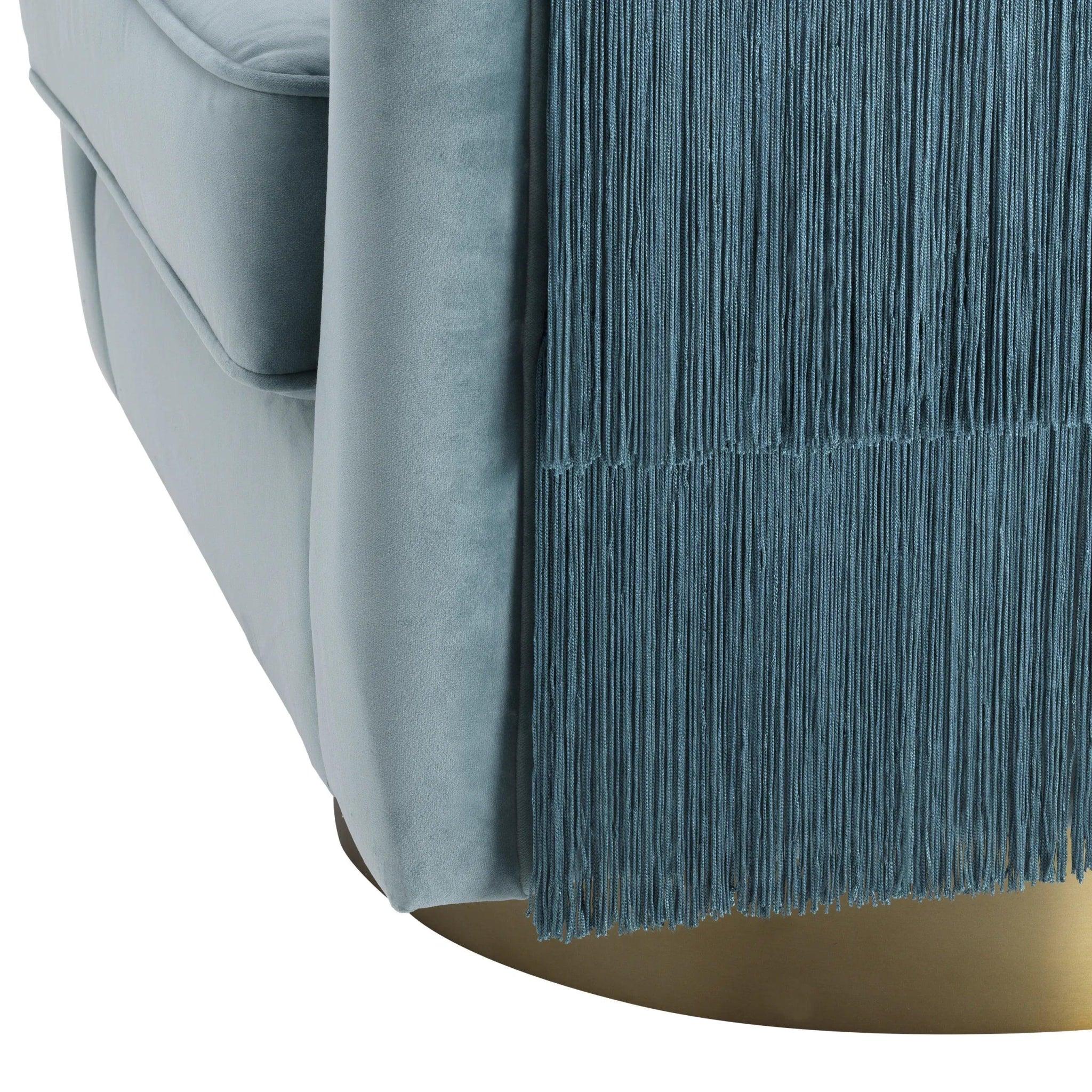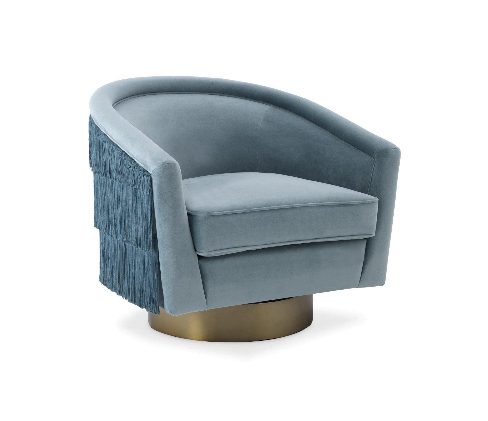 Sametová poťahová látka v hlbokom odtieni modrej Savona priťahuje pohľady a dodáva nábytku výnimočný charakter. Zadná časť kresla je ozdobená efektnými strapcami v tej istej farbe, čo mu dodáva rafinovanosť a eleganciu. Okrúhla otáčacia základňa z brúseného mosadze nie je len funkčná, ale aj dôležitým dekoratívnym prvkom, ktorý podčiarkuje jedinečný charakter kresla.