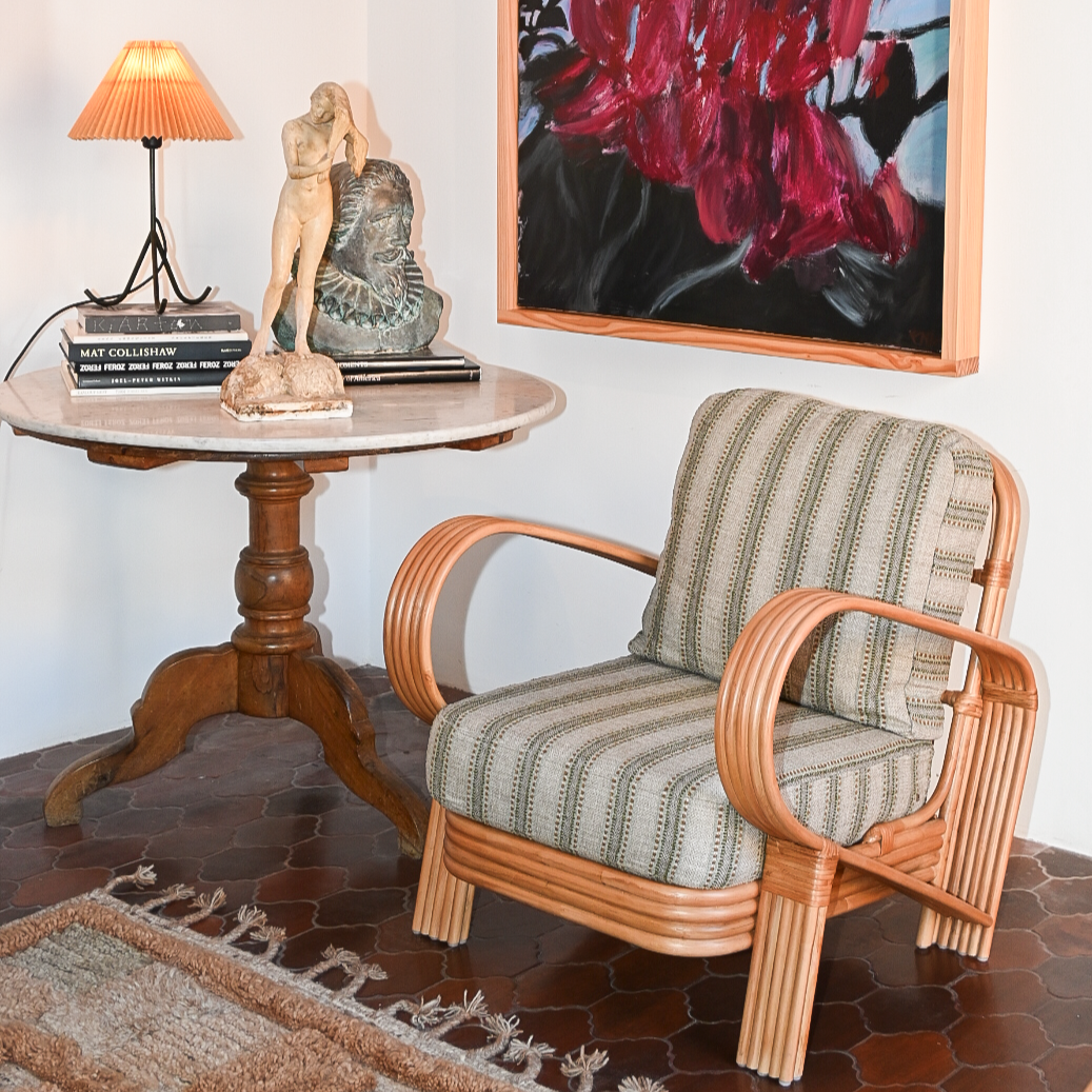 Fotel Bamboo Green je jedinečná kombinácia prírodných materiálov a elegantného dizajnu v retro štýle. Ručne vyrobená konštrukcia z moreného bambusu očarí svojou ľahkosťou a exotickým charakterom, zatiaľ čo mäkké vankúše sedadla a operadla potiahnuté pruhovanou tkaninou v odtieňoch zelenej prinášajú do interiéru jemnú sviežosť. Je to nábytok, ktorý spája pohodlie s jedinečnou estetikou, vytvárajúc priateľskú a útulnú atmosféru.