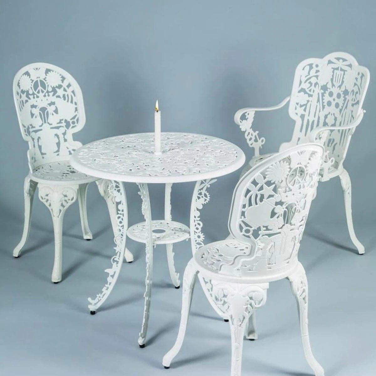 Výnimočné záhradné kreslo v viktoriánskom štýle v novom, avantgardnom vydaní je dielom talianskej značky Seletti. Opierka a sedadlo skrývajú v sebe množstvo, neobvyklých vzorcov, ako sú ozubené kolesá či kvety, čo dodáva celku jedinečný charakter.