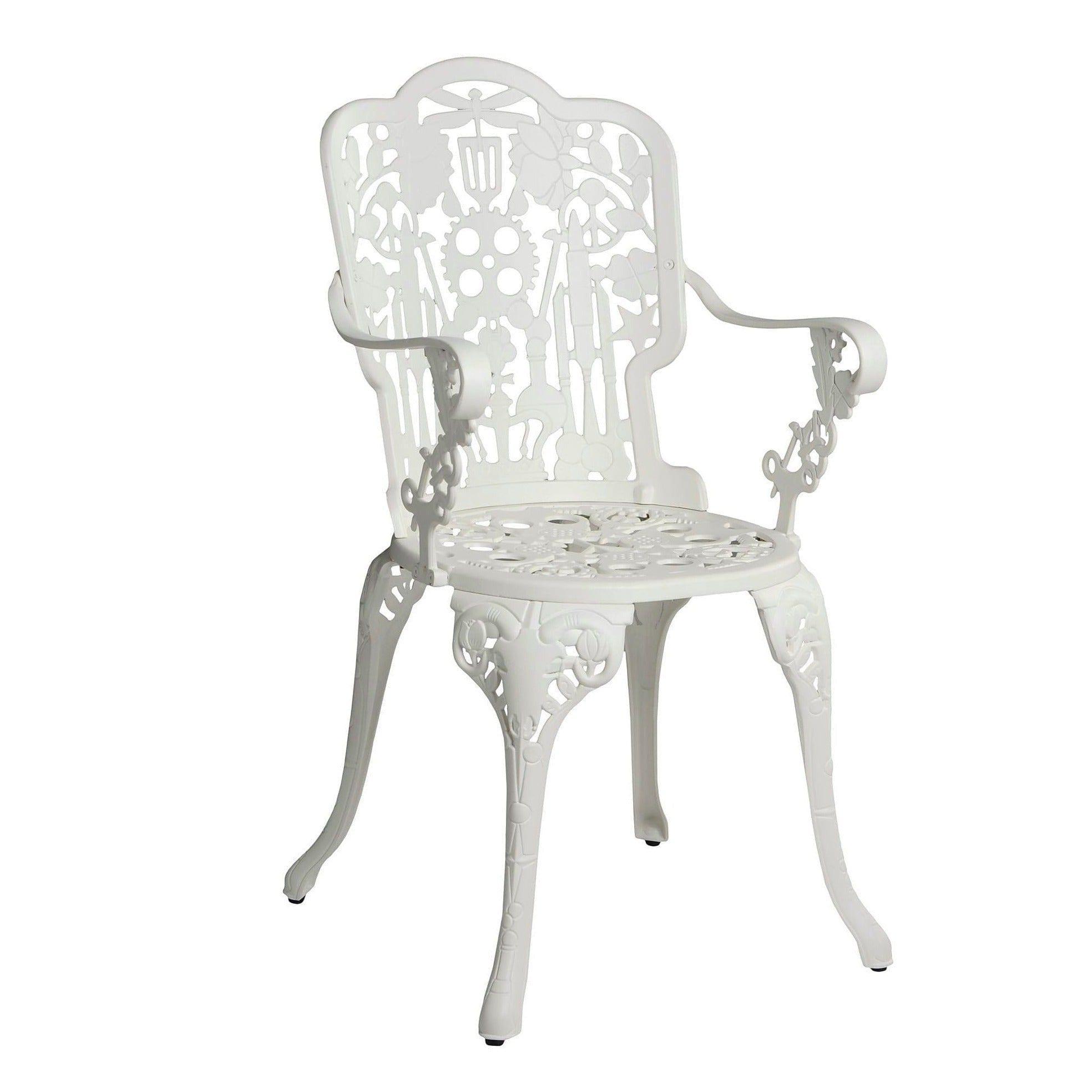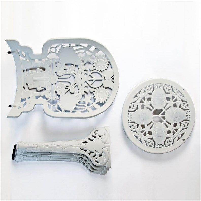 Výnimočné záhradné kreslo v viktoriánskom štýle v novom, avantgardnom vydaní je dielom talianskej značky Seletti. Operadlo a sedadlo skrývajú v sebe množstvo nezvyčajných vzorov, ako sú ozubené kolesá či kvety, čo dodáva celku jedinečný charakter.