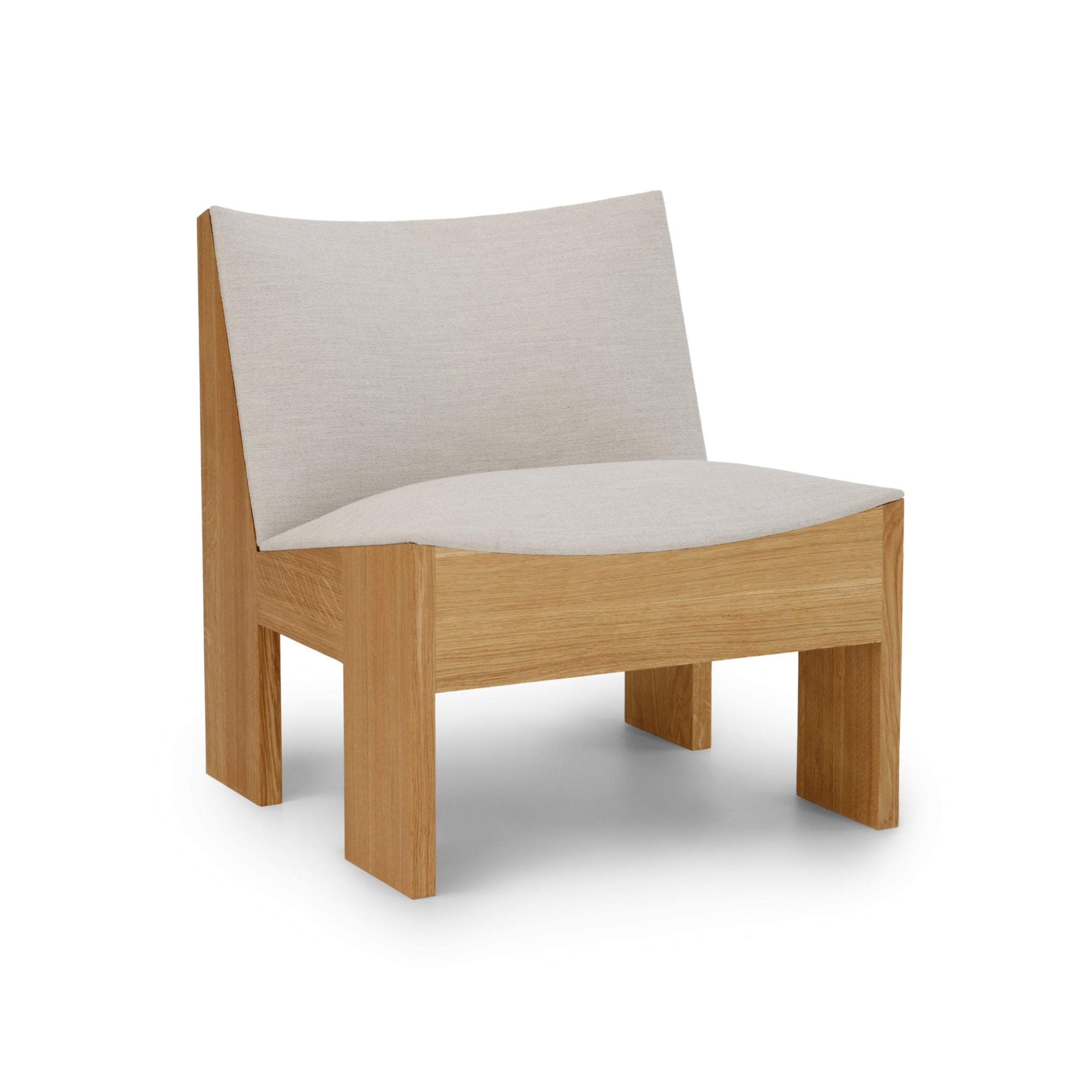 Jednoduché línie a masívnosť drevenej základne tvoria elegantný rám pre mäkký, čalúnený povrch sedadla. Jemné, pružné krivky pridávajú ľahkosť a komfort, vytvárajúc dojem ochranného obalu okolo mäkkého vnútorného priestoru. Béžová čalúnená tkanina podčiarkuje prirodzený charakter fotela, pridávajúc mu útulnosť a univerzálny štýl.