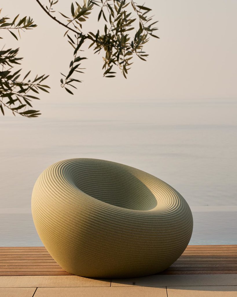 Fotel Nami je výsledkom otáčania sekcie okolo diagonálnej osi, čo mu dáva dokonale okrúhly tvar. Pozdĺž povrchu fotela bežia tvarované prvky, ktoré sa rozvíjajú od centra k okrajom v podobe sekvencie koncentických prstencov. V centrálnej časti fotela sa nachádza kanál umožňujúci odtok vody. Nami je dostupný v šiestich farbách, z ktorých tri majú jednotný odtieň, a ostatné tri vznikli recyklovaním materiálov, spájajúc 2-3 rôzne tóny farieb.