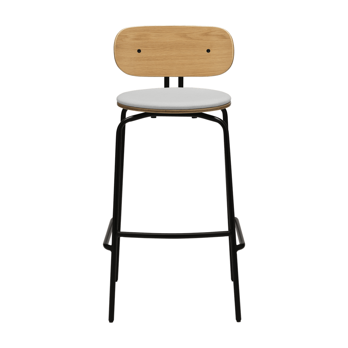 Barový stolička Curious bol navrhnutý s ohľadom na komfort a estetiku – jednoduchá, kovová priečka slúži ako pohodlný opierka na nohy, zabezpečujúc prirodzenú polohu pri sedení a podporujúc dlhé, uvoľnené rozhovory.