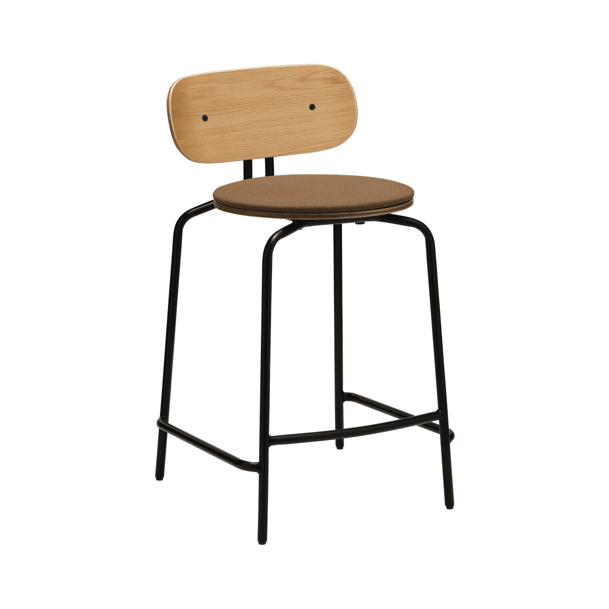 Barový stolička Zvedavý bol navrhnutý s ohľadom na komfort a estetiku – jednoduchá, kovová priečka slúži ako pohodlný podnožník, zabezpečujúci prirodzenú polohu pri sedení a podporujúci dlhé, uvoľnené rozhovory.