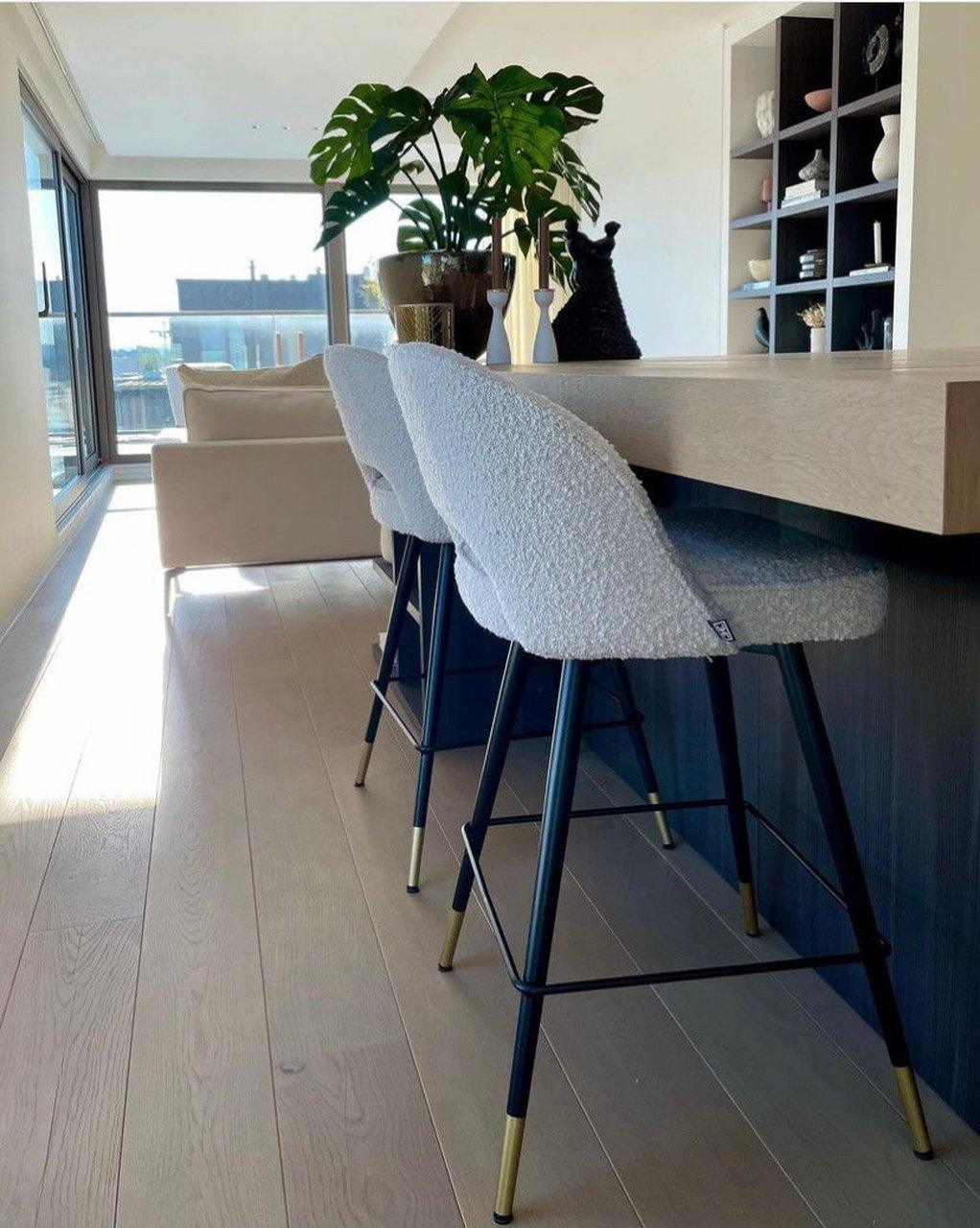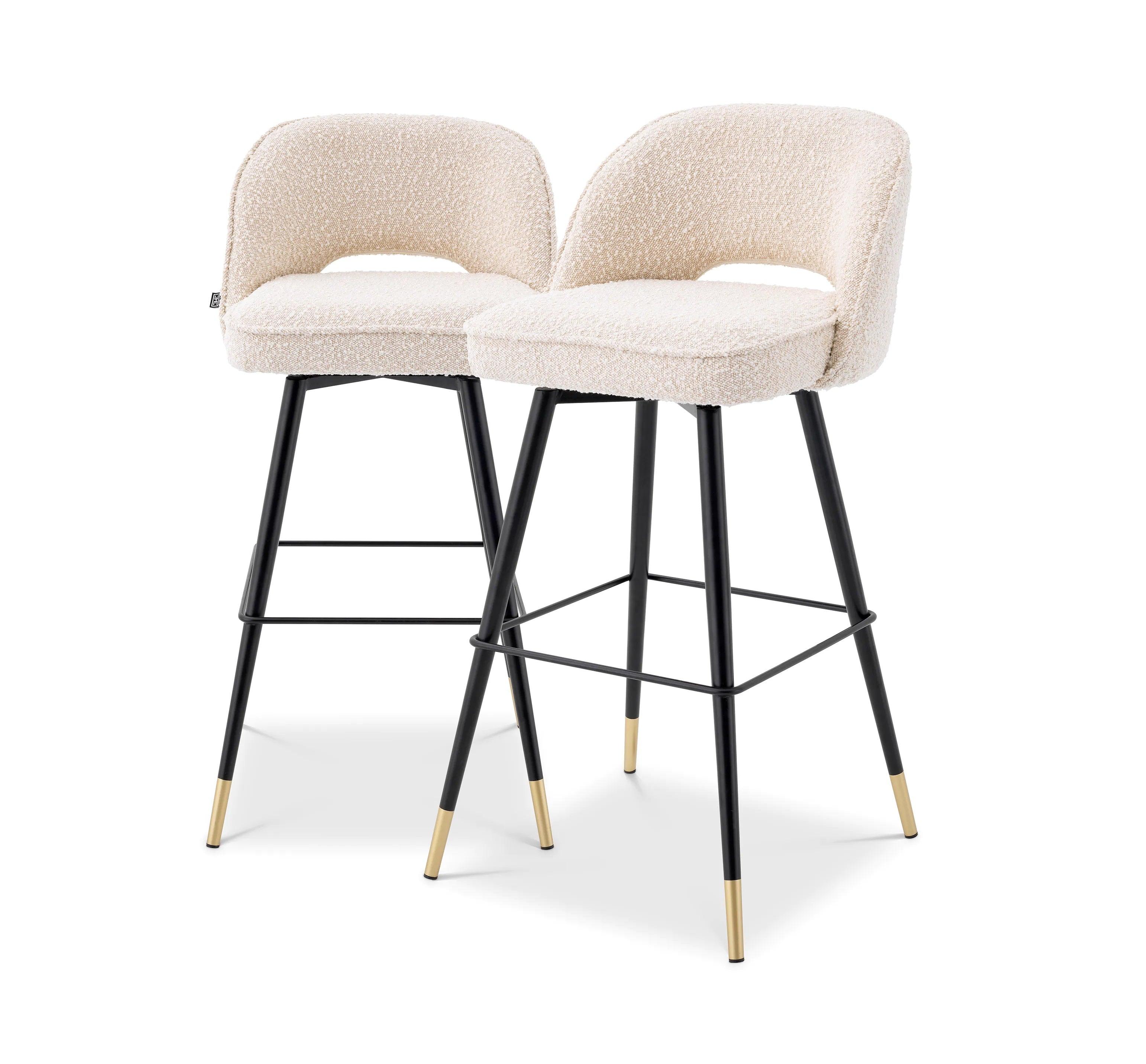 Zadbaj o elegancję i wyrafinowanie swojego wnętrza dzięki hokerom Cliff. Zestaw dwóch hokerów w tkaninie boucle stanowi esencję luksusu i klasy. Każdy kremowy hoker posiada solidną ramę, która opiera się na czarnych, zwężanych nogach z doskonałym akcentem w postaci złotych nakładek. Ich wyjątkowość podkreśla oparcie bez ramion, które zostało artystycznie otwarte u dołu przed siedziskiem, dodając designowi lekkości.