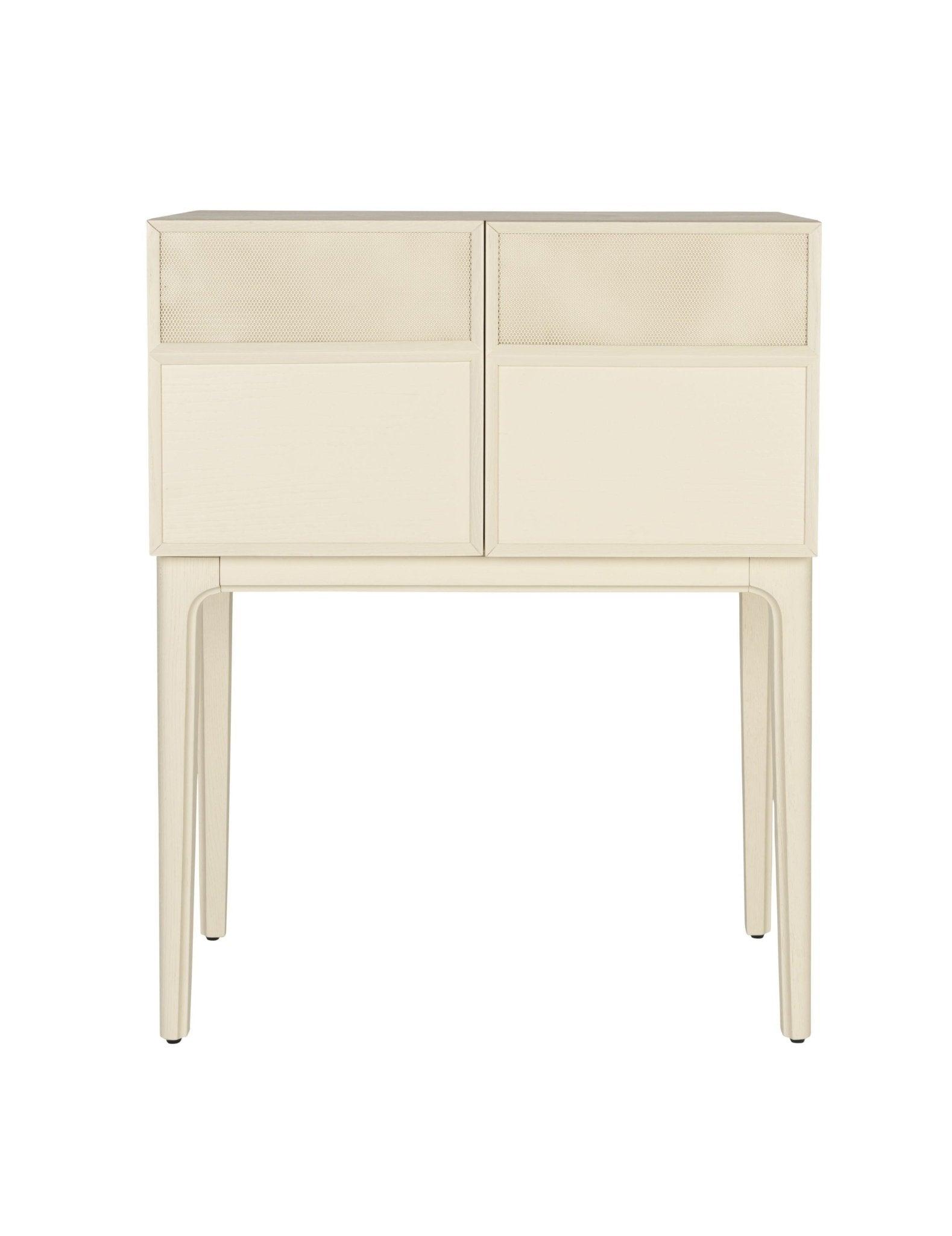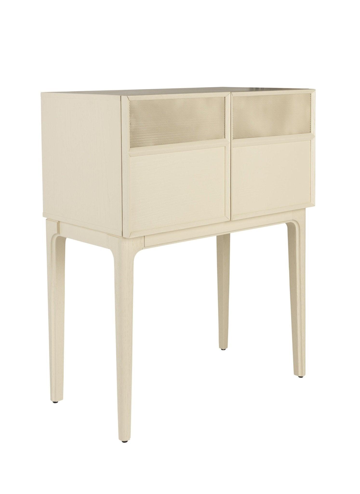 Povrch v krémovej farbe krásne zvýrazňuje prirodzený vzor letokruhov duba. Kovové, mriežkované dvere majú pútavé panely. Zdvihnuté nohy dodávajú komode ľahkosť.