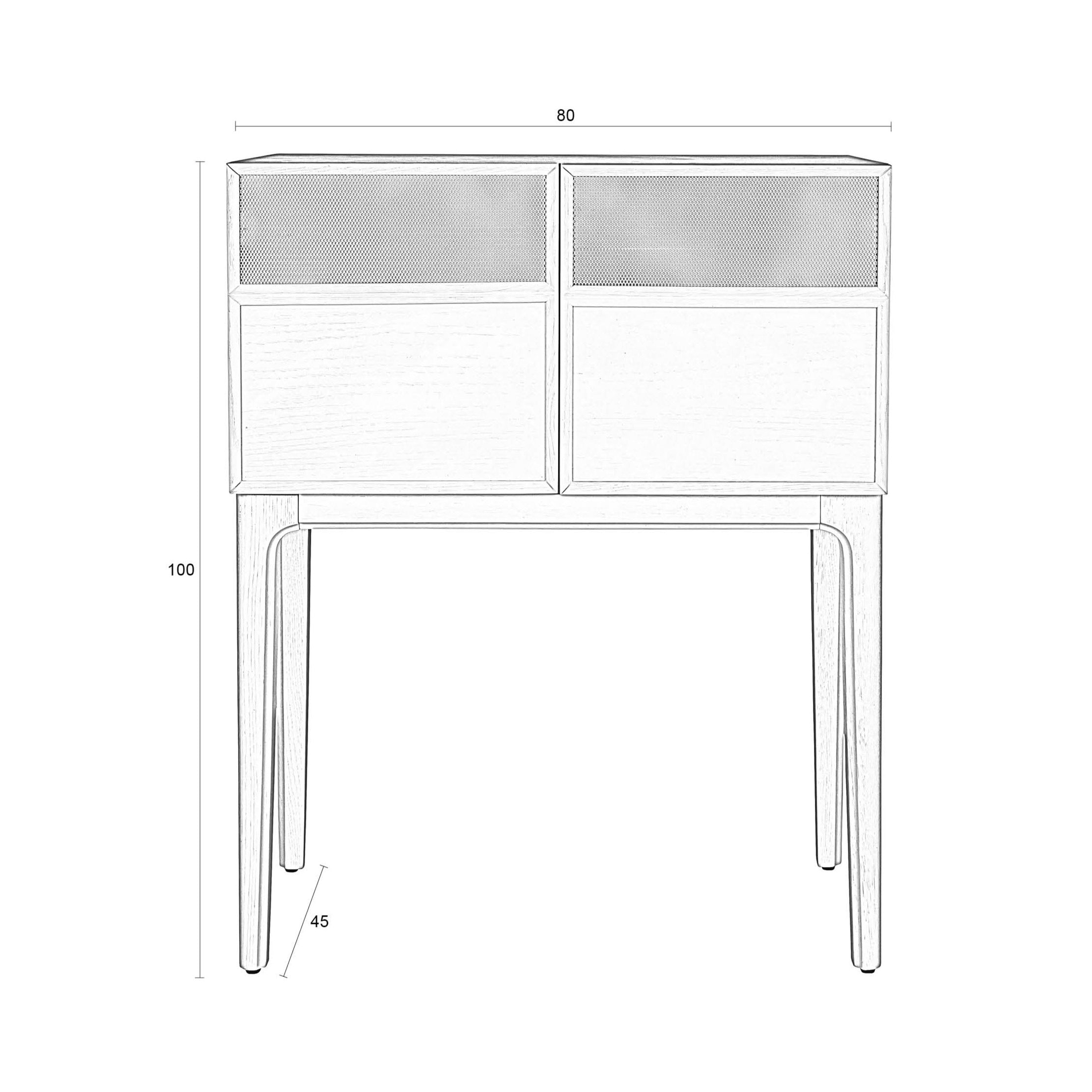 Povrch v modrej farbe krásne zvýrazňuje prirodzený vzor letokruhov duba. Kovové, mriežkované dvere majú pútavé panely. Zvýšené nohy dodávajú komode ľahkosť.