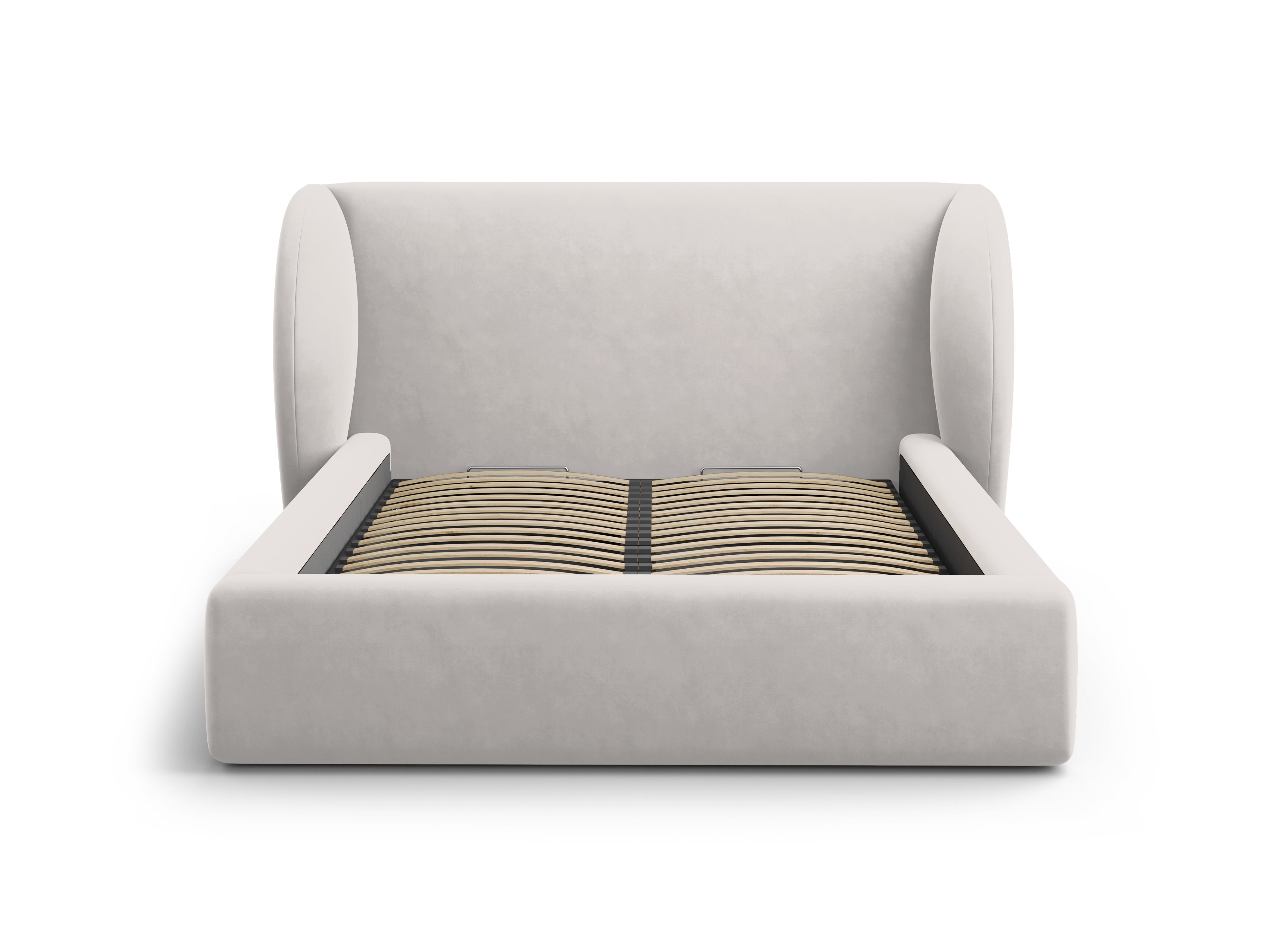 Posteľ Miley nie je len pôsobivá, ale aj praktická – vybavená priestranným úložným priestorom na posteľnú bielizeň, ktorý sa otvára spredu pomocou plynových piestov. Je to ideálny výber pre tých, ktorí si cenia spojenie estetiky, funkčnosti a komfortu v spálni.