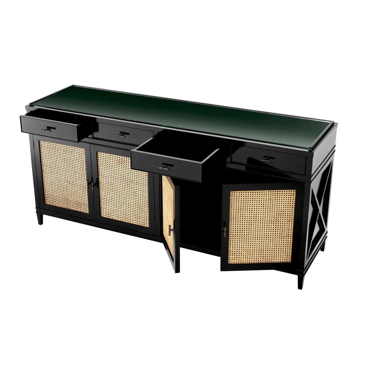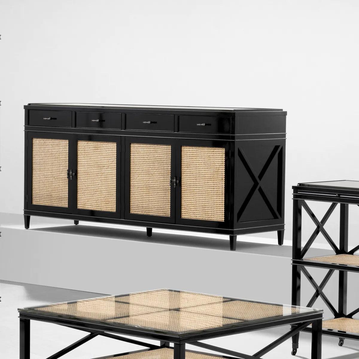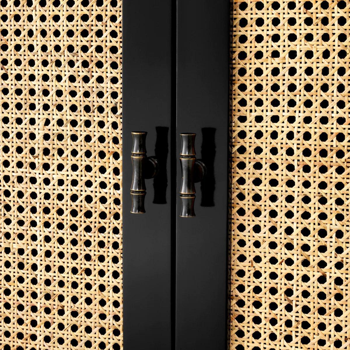 Vybavená dvojitou skrinkou s dvoma zásuvkami, drevenou poličkou a dvoma dvierkami, komoda Bahamas ponúka veľa miesta na uskladnenie rôznych predmetov. Vyrobená z mahagónového dreva, prírodnej sieťky z trstiny a priehľadného skla, táto komoda spája rôzne materiály, čím vytvára harmonický celok. Čierne prevedenie dodáva komode eleganciu a moderný vzhľad, zatiaľ čo priečky pridávajú ďalší prvok dizajnu, zdôrazňujúc jej jedinečný charakter. Kombinácia rôznych textúr a farieb robí z komody Bahamas nielen praktický nábytok, ale aj dekoratívny akcent, ktorý priťahuje pohľady.