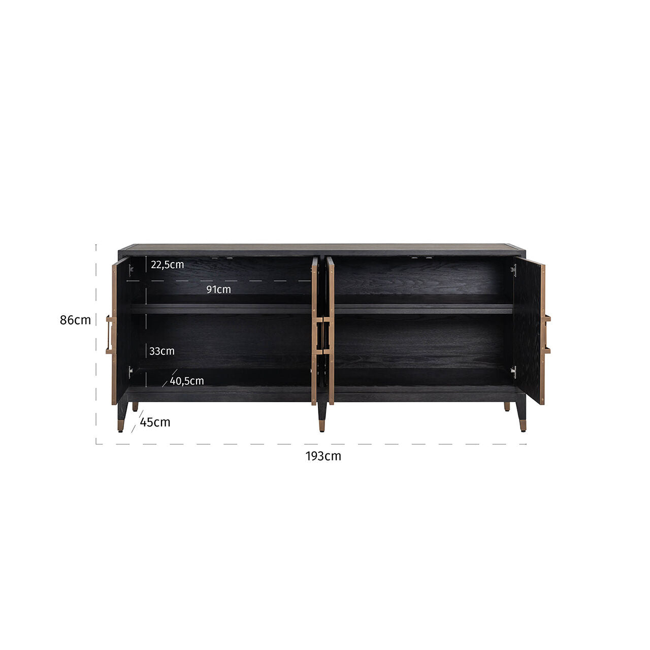 Dubové rámy morené na čierno tvoria pevnú a elegantnú konštrukciu, ktorá sa dokonale hodí k iným materiálom. Geometricky tvarované úchytky v mosadznej farbe pridávajú komode eleganciu a luxusný akcent. Dvere komody sú starostlivo ozdobené replikou kože shagreen, čo dodáva nábytku textúrový charakter a evokuje odkazy na estetiku 20. rokov 20. storočia.