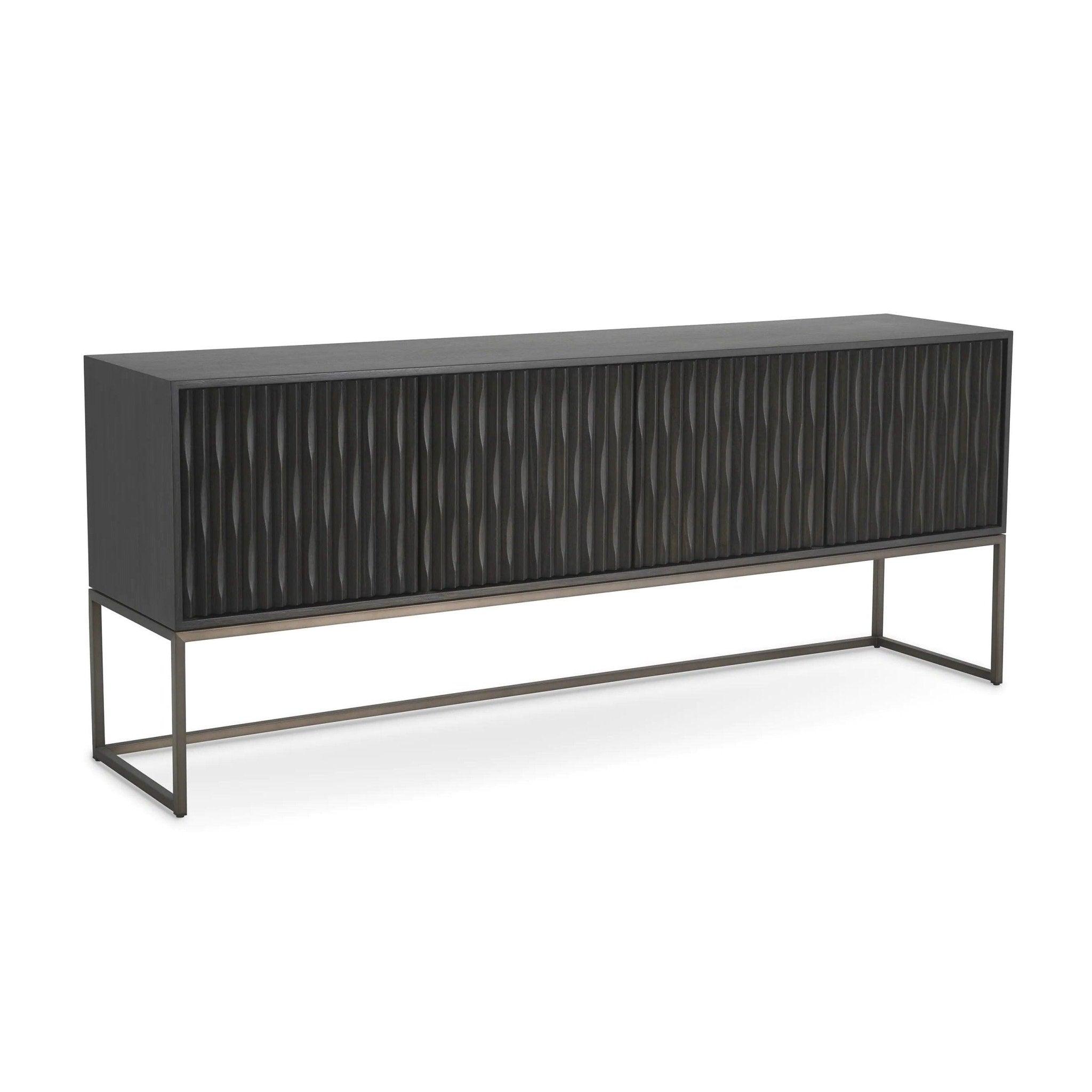 Grafitová komoda Brayden sa výnimočne prezentuje vďaka dubovému dyhe v grafitovo-sivej farbe. Táto farebná paleta dodáva nábytku moderný charakter, pričom zostáva elegantnou a univerzálnou voľbou pre rôzne aranžmány interiérov. Stojaca na elegantnom ráme s hnedým povrchom, komoda Brayden priťahuje pozornosť svojím kontrastom.