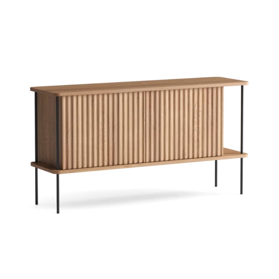 Komoda Maya je výrazný kus nábytku, ktorého vlnitý, ryhovaný front priťahuje pozornosť ako umelecké dielo. Kombinácia masívneho dreva a chladnej ocele jej dodáva moderný, no zároveň teplý charakter, a bočná polica dokonale vystavuje gramofón a zbierku vinylov, čím vytvára funkčnú a štýlovú zónu na relaxáciu.
