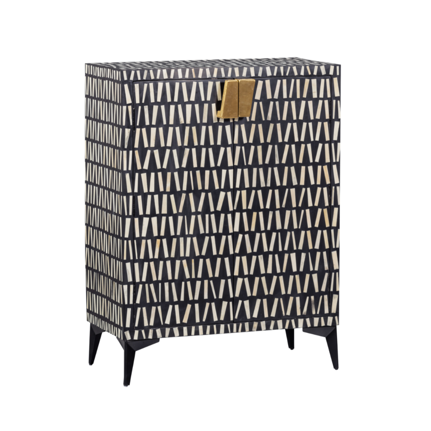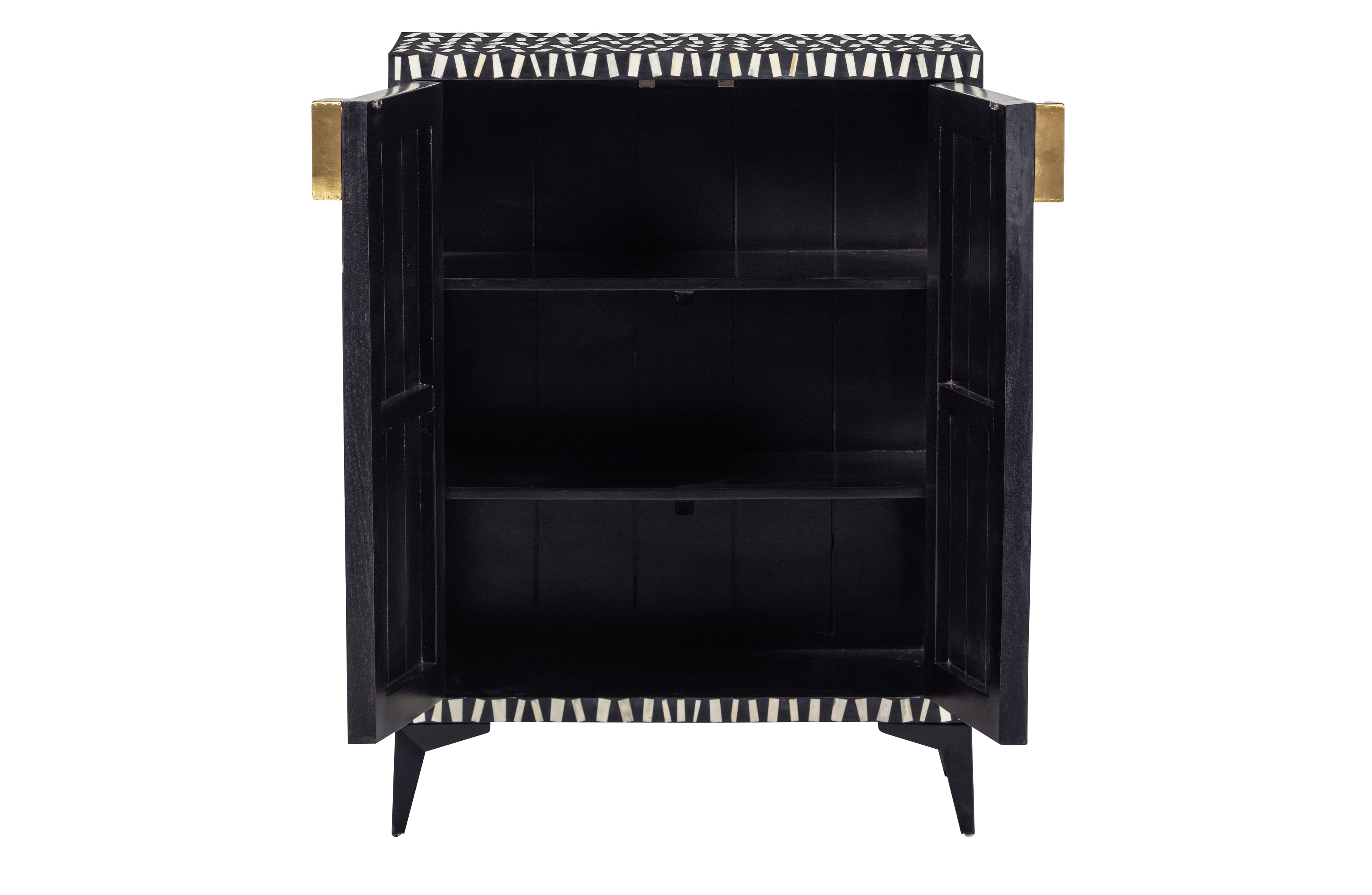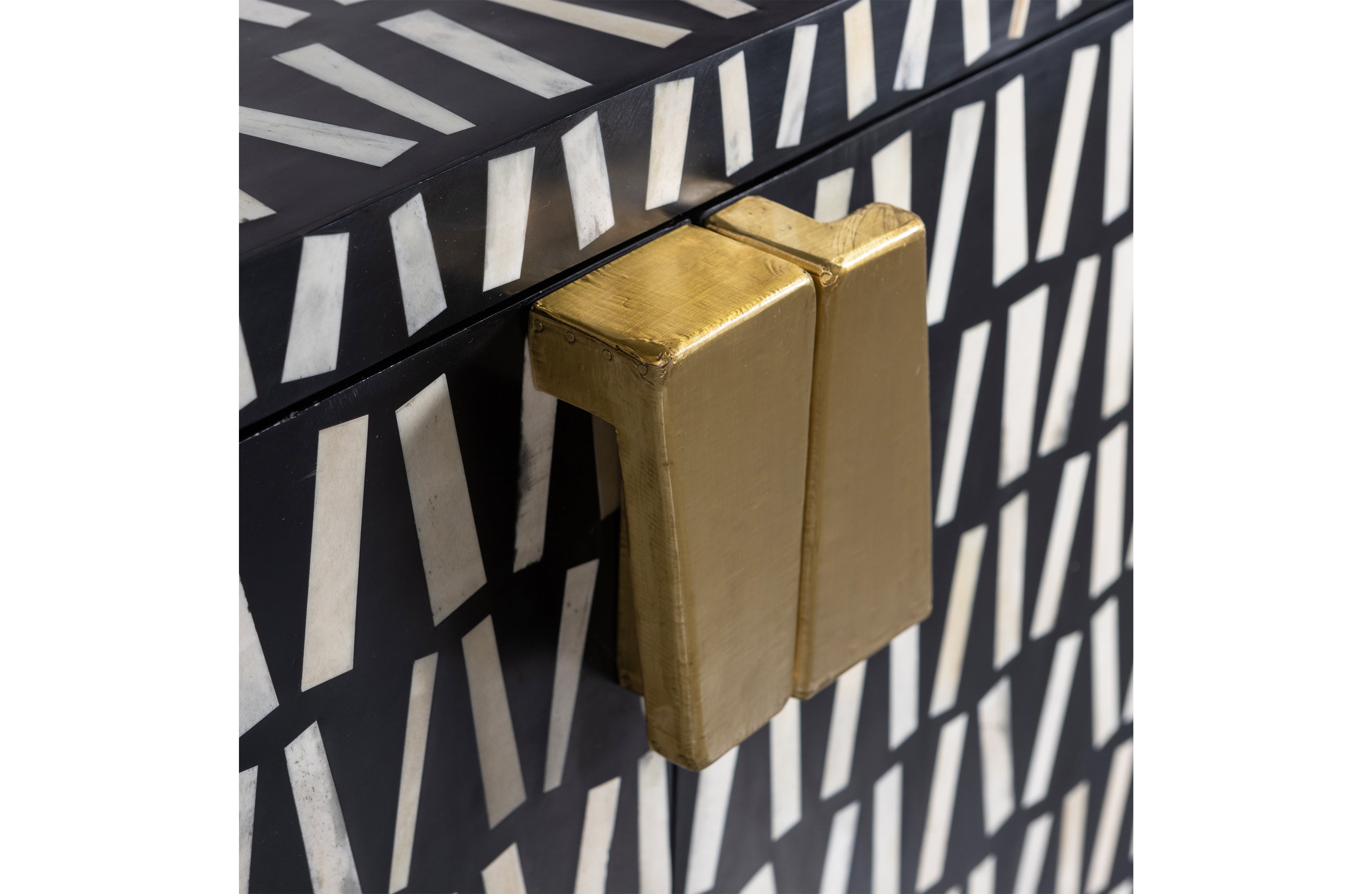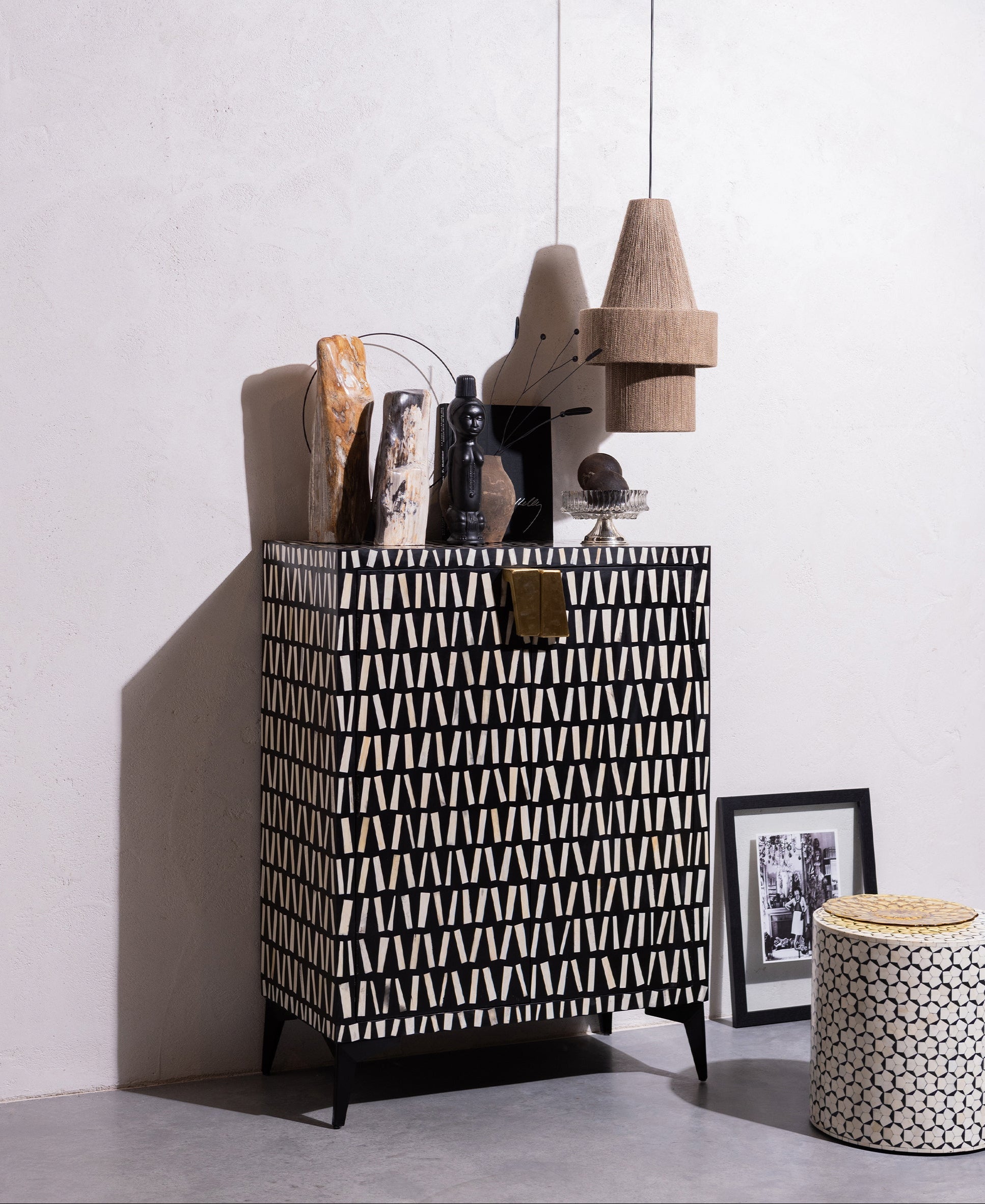 Komoda Menne z mangového dreva je výnimočný kus nábytku, ktorý okamžite upúta pozornosť svojím dekoratívnym čelom a elegantným spracovaním. Dizajnový charakter podčiarkuje ručne vyrobená mozaika z prírodnej kosti – suroviny získavanej z organických odpadov, čo z neho robí estetickú aj ekologickú voľbu. Čierne matné mangové drevo dodáva celku hĺbku a charakter, zatiaľ čo štíhla kovová základňa pridáva ľahkosť. Menne ponúka nielen štýl, ale aj praktickosť – vo vnútri sa nachádza množstvo miesta na uskladnenie najpotrebnejších vecí.