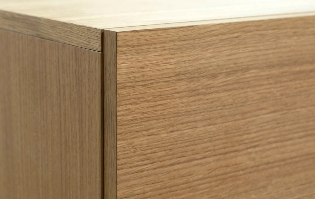 Celá konštrukcia dubovej komody je vyrobená z najkvalitnejšej dubovej dyhy, čo zvyšuje nielen jej trvácnosť, ale aj estetiku a vizuálnu hodnotu. Dubová dyha dodáva nábytku výnimočný, prírodný charakter, vnášajúc do interiéru teplo a vznešenosť.