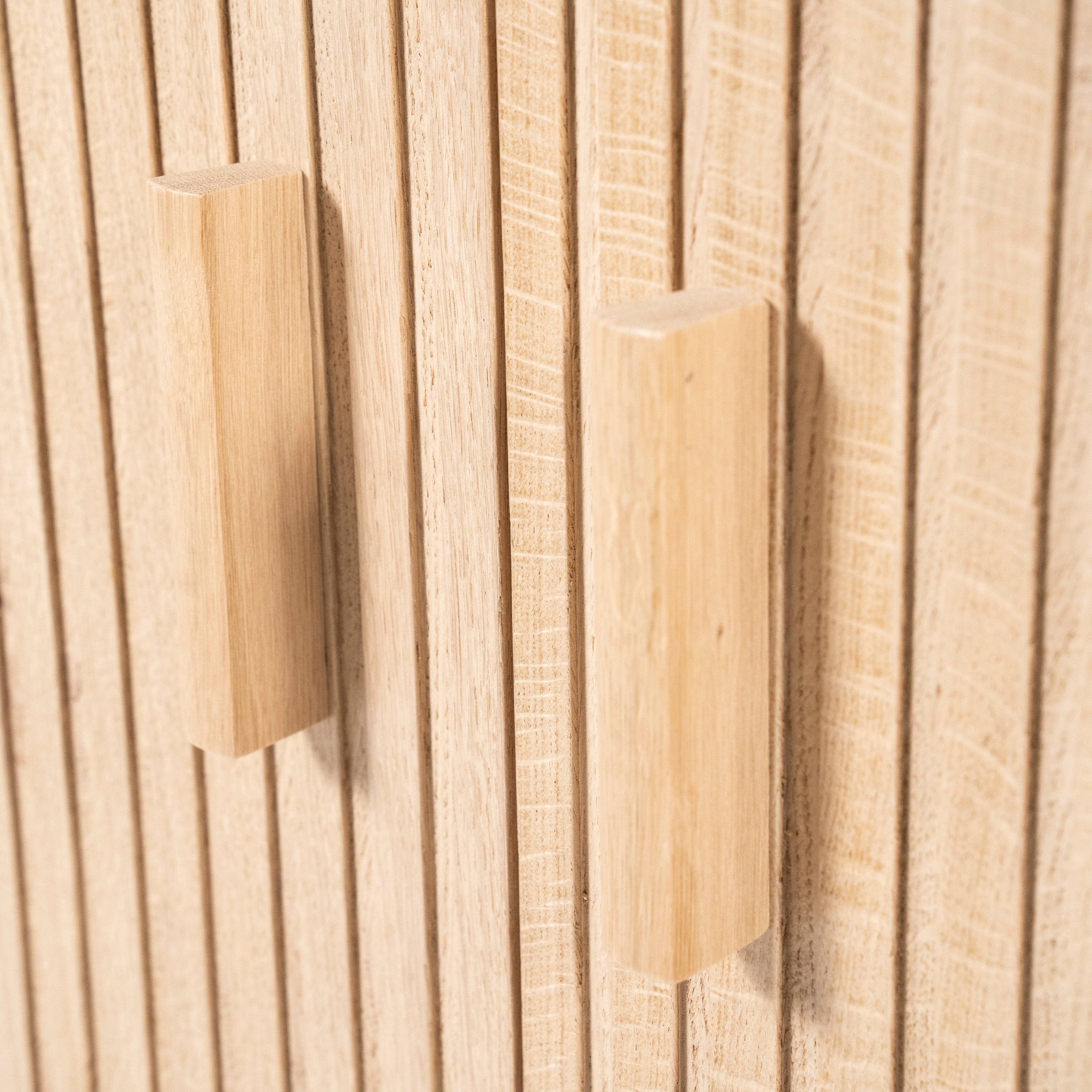 Cztery pojemne drzwiczki skrywają obszerne wnętrze, które pozwala wygodnie przechowywać zastawę stołową, tekstylia, dokumenty lub akcesoria codziennego użytku. Subtelne uchwyty i lekka wizualnie konstrukcja podkreślają minimalistyczny charakter mebla, a naturalna barwa dębu ociepla przestrzeń. To komoda, która nie tylko organizuje domową przestrzeń, ale również dodaje jej elegancji i wyrafinowanej prostoty.