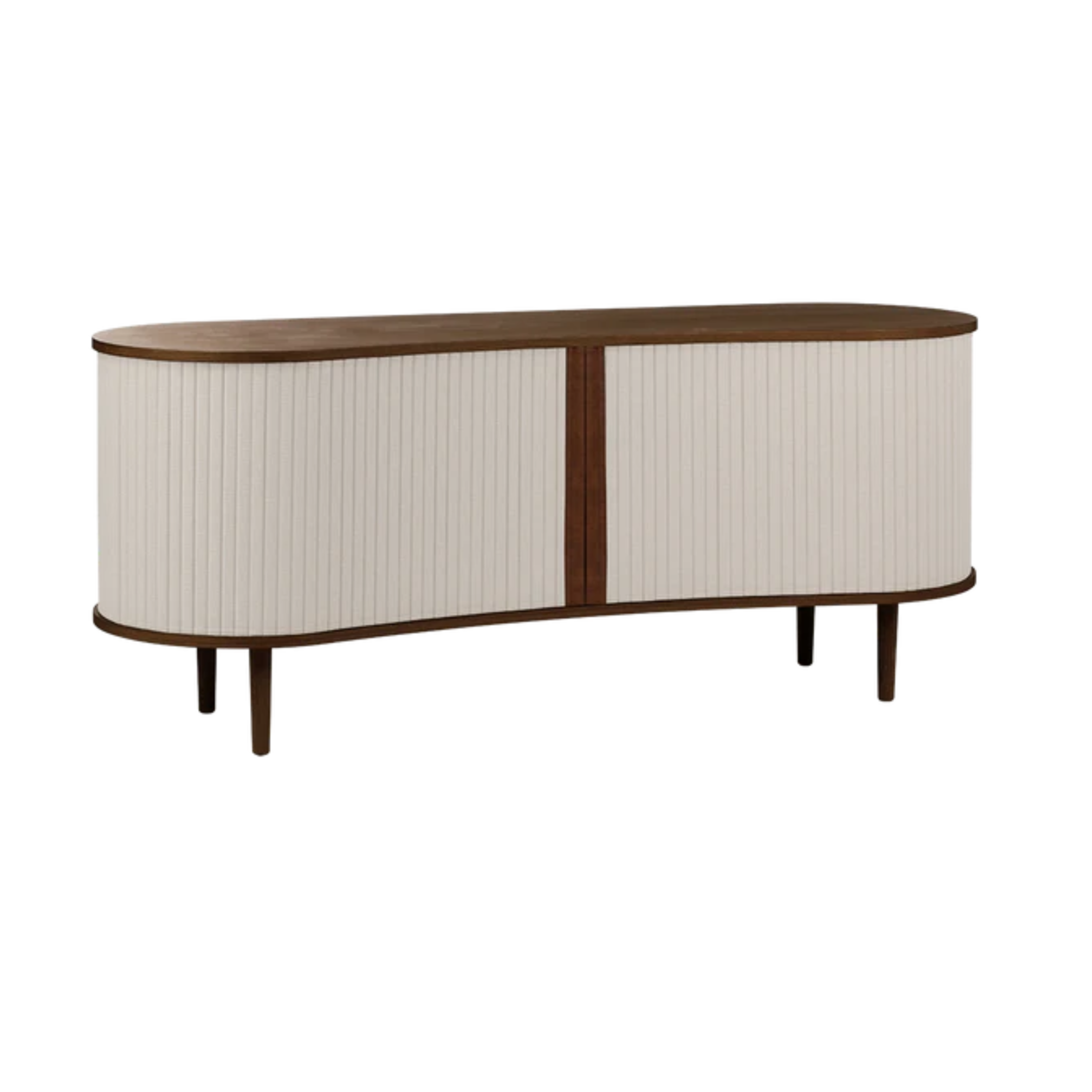 Charakteristické posuvné dvere tambour vyrobené z textílie nielenže priťahujú pozornosť, ale tiež dodávajú nábytku jemný, luxusný výraz. Nastaviteľné police a diskrétne skryté otvory v zadnej stene umožňujú uskladnenie RTV zariadení bez narušenia estetiky interiéru. Navyše, dvere tambour je možné ľahko vymeniť, čím komode dodáte nový vzhľad bez nutnosti výmeny celého nábytku - je to ekologické a trvácne riešenie.