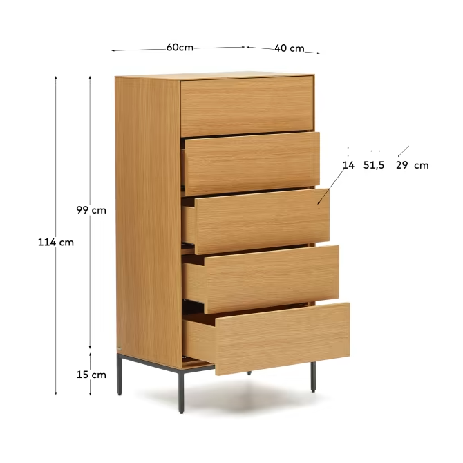 Vysoká komoda so zásuvkami Vedrana, vytvorená skúseným dizajnérskym tímom La Forma, predstavuje dokonalú harmóniu medzi dubovým dyhou a oceľou, čím vytvára jedinečné spojenie funkčnosti a estetiky. Toto unikátne spojenie materiálov robí z Vedrany ideálny kúsok pre rôzne typy domov a štýly zariadenia, pričom zdôrazňuje ich eleganciu a modernosť.