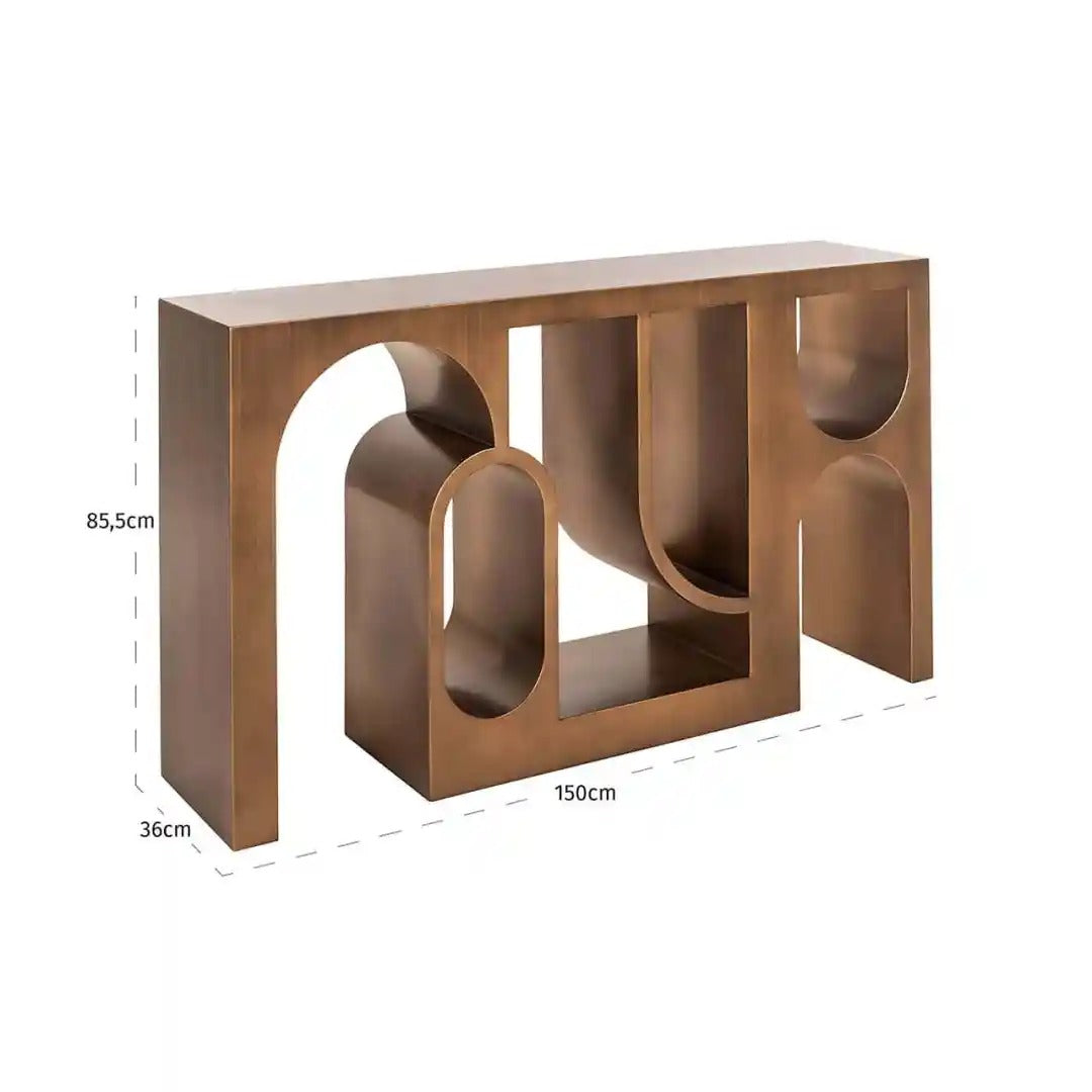 Výnimočná konzola Lugano je dizajnový nábytok so sochárskou formou, ktorý upúta pozornosť originálnym usporiadaním geometrických tvarov. Vyrobená z železa a pokrytá elegantným, medeným povrchom, skvele sa hodí do moderných aj industriálnych interiérov. Konzola perfektne spája dekoratívnu funkciu s praktickosťou, vytvárajúc priestor na vystavovanie ozdôb, kníh alebo lampy.