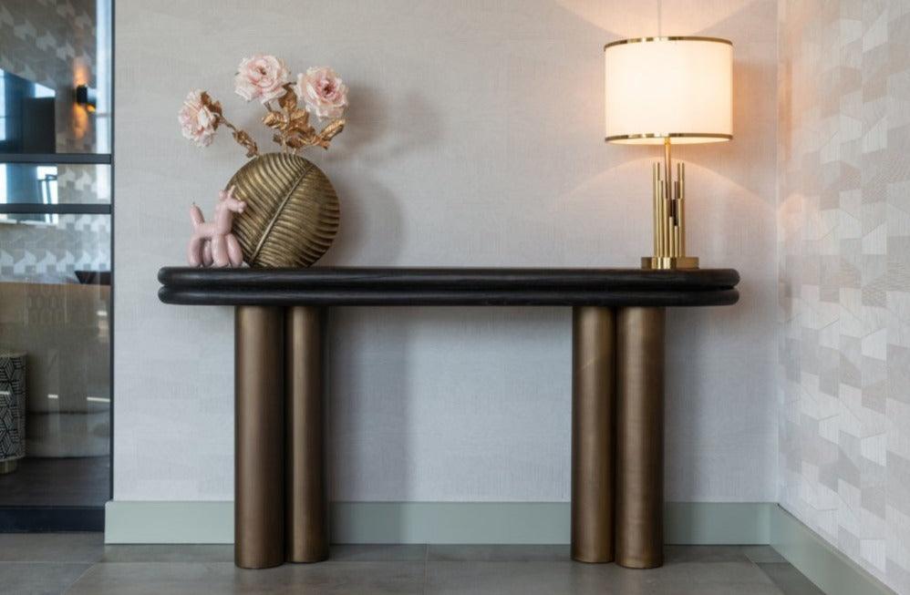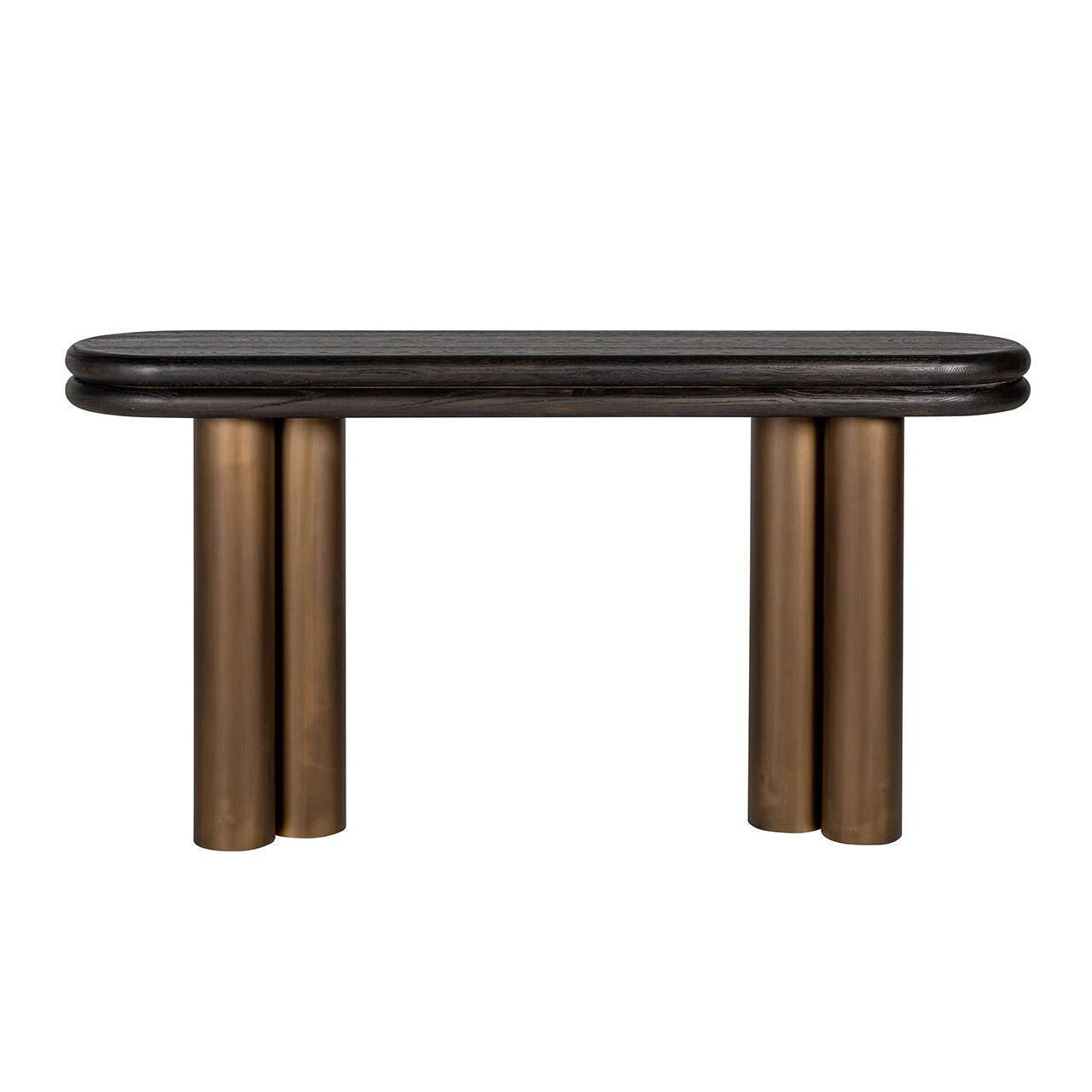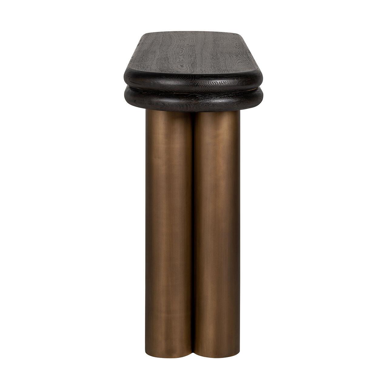 Konzola Macaron v odtieňoch tmavej hnedej a mosadze je výnimočná ponuka, ktorá inšpiruje eleganciou a vkusom. Kolekcia spája dvojité dubové rustikálne dosky v čiernej farbe, ktoré spočívajú na pevných kovových nohách krásne dokončených v odtieni mosadze.