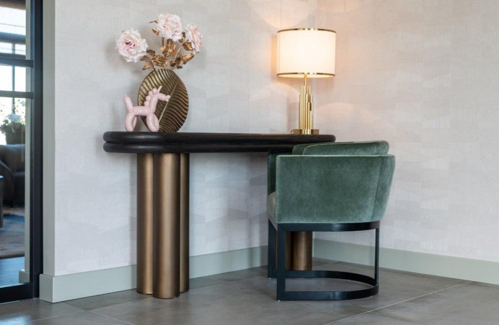 Konzola Macaron je plná pôvabu, pripomínajúc svojím dizajnom a názvom sladkú pochúťku, ktorej neodmysliteľné sú prvky chuti a jedinečnosti. Dvojité dubové dosky v rustikálnom odtieni čiernej vnášajú do priestoru teplo a charakter, vytvárajúc ideálny kontrast k kovovým nohám. Dokončenie nôh v farbe mosadze pridáva konzole trochu lesku a vznešenosti.