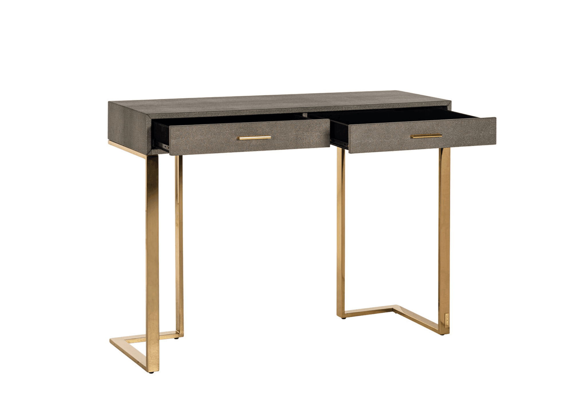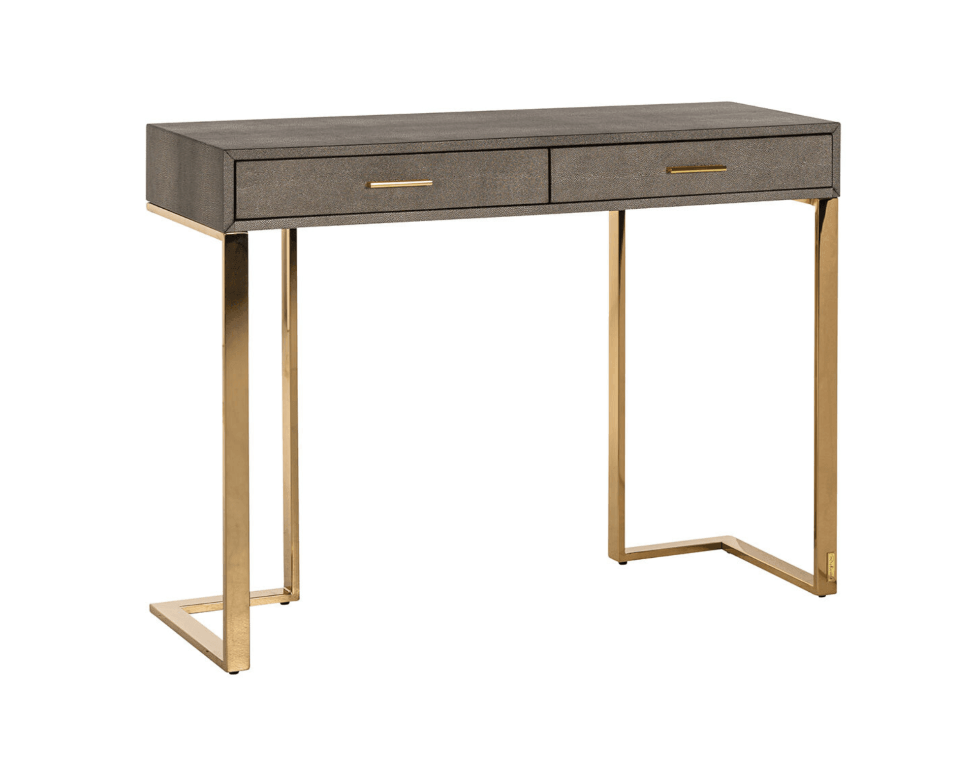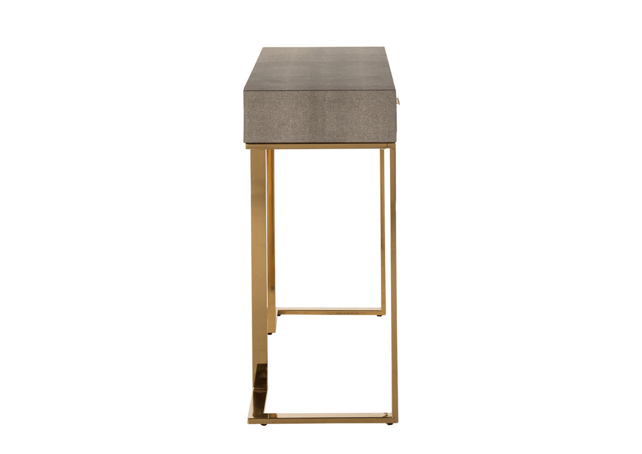 Vrchná doska vyrobená z pevnej MDF dosky nielenže zabezpečuje trvácnosť, ale aj esteticky pôsobí. Zaujímavé povrchové spracovanie dosky pridáva hĺbku a jedinečnosť, pričom zdôrazňuje jej charakter. Zlaté detaily vyrobené z lesklej nehrdzavejúcej ocele predstavujú elegantný akcent, ktorý priťahuje pozornosť a dodáva nábytku luxusný vzhľad. Zlaté prvky krásne kontrastujú s ostatnými časťami konzoly, vytvárajúc harmonickú rovnováhu medzi eleganciou a modernosťou.