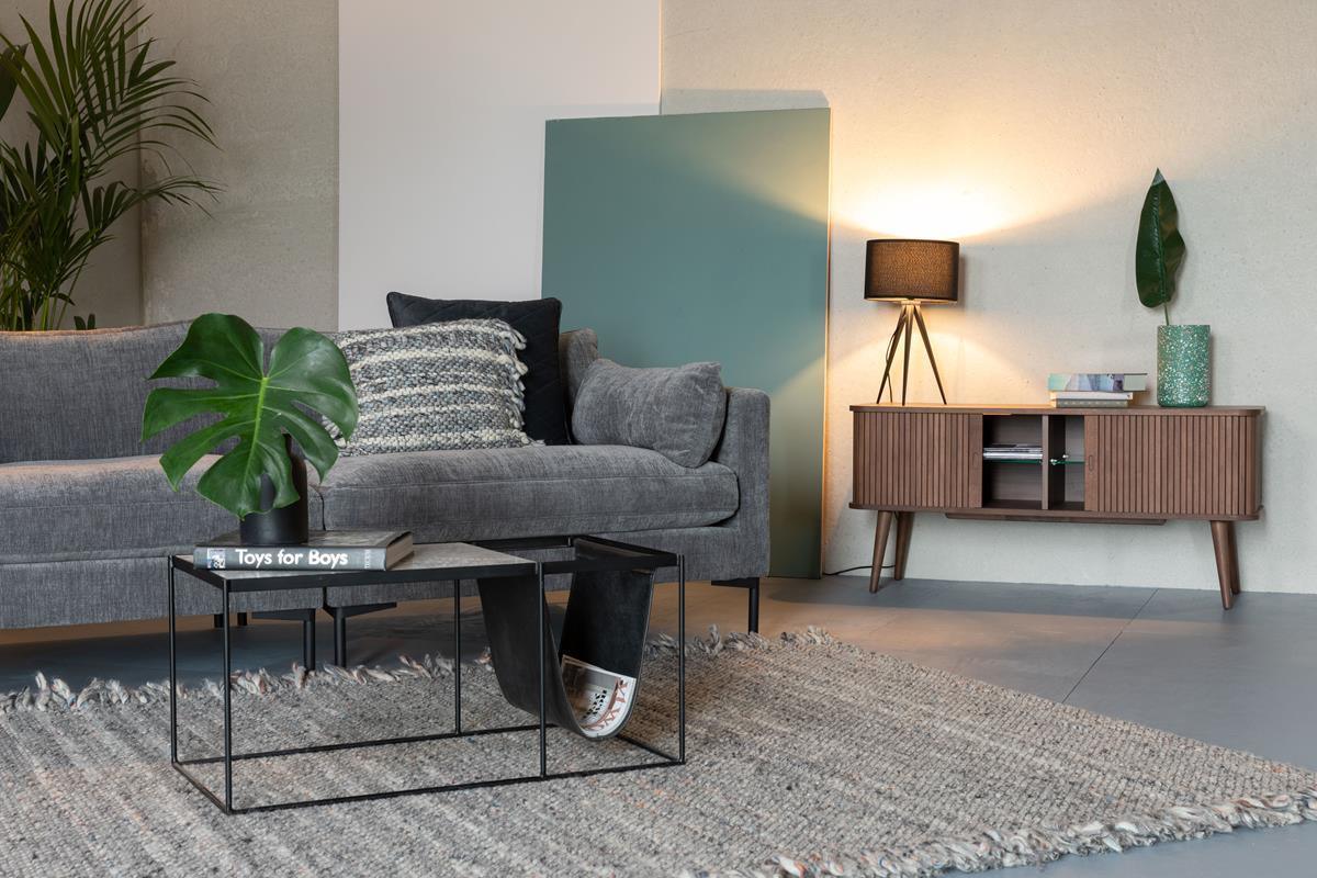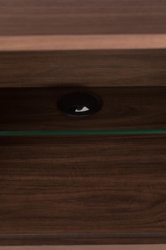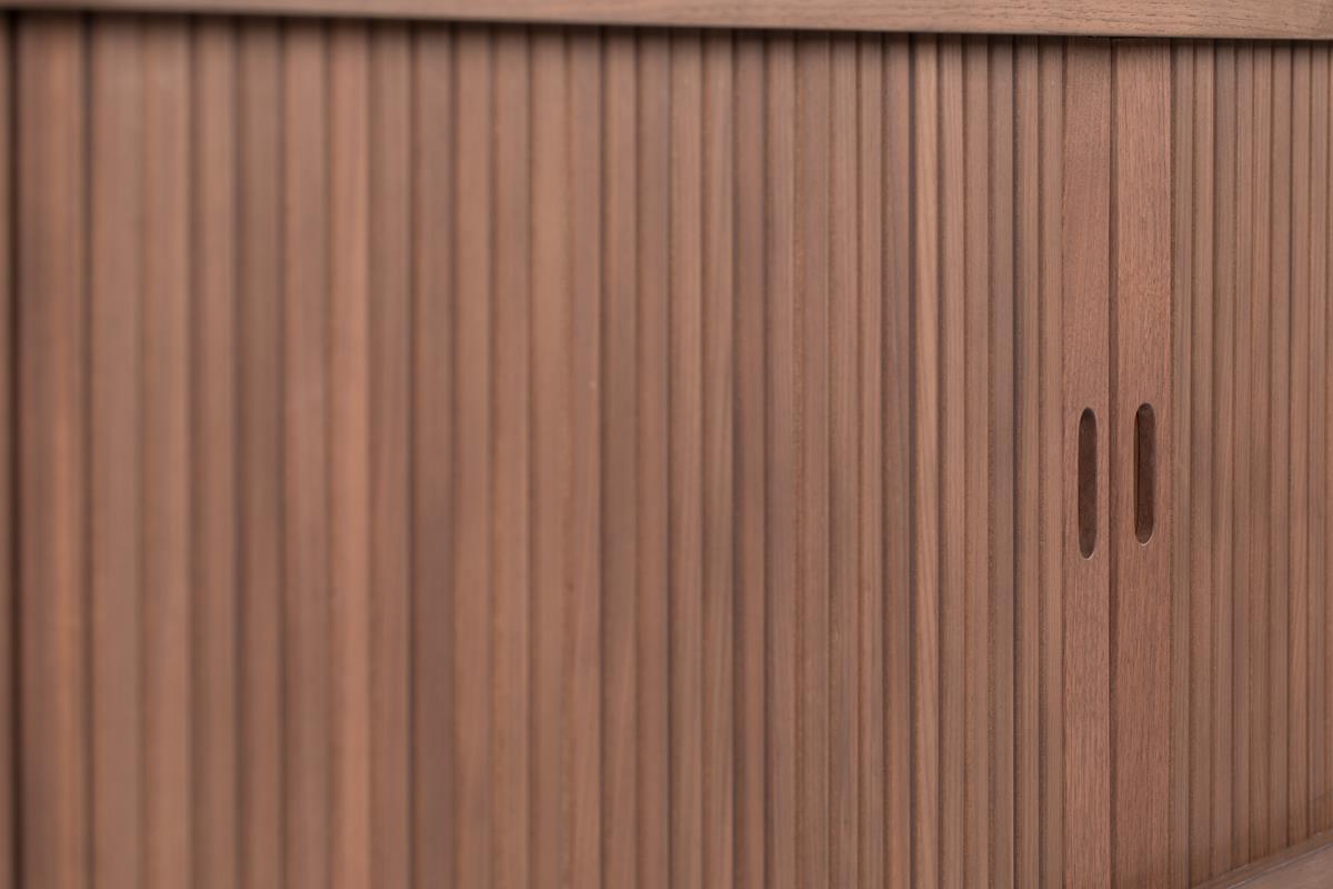 Górna i dolna płyta MDF z fornirem orzechowym, wewnętrzne panele MDF z folią. Lakierowane nogi z litego drewna i litej gumy. Wykończony bezbarwnym lakierem PU.