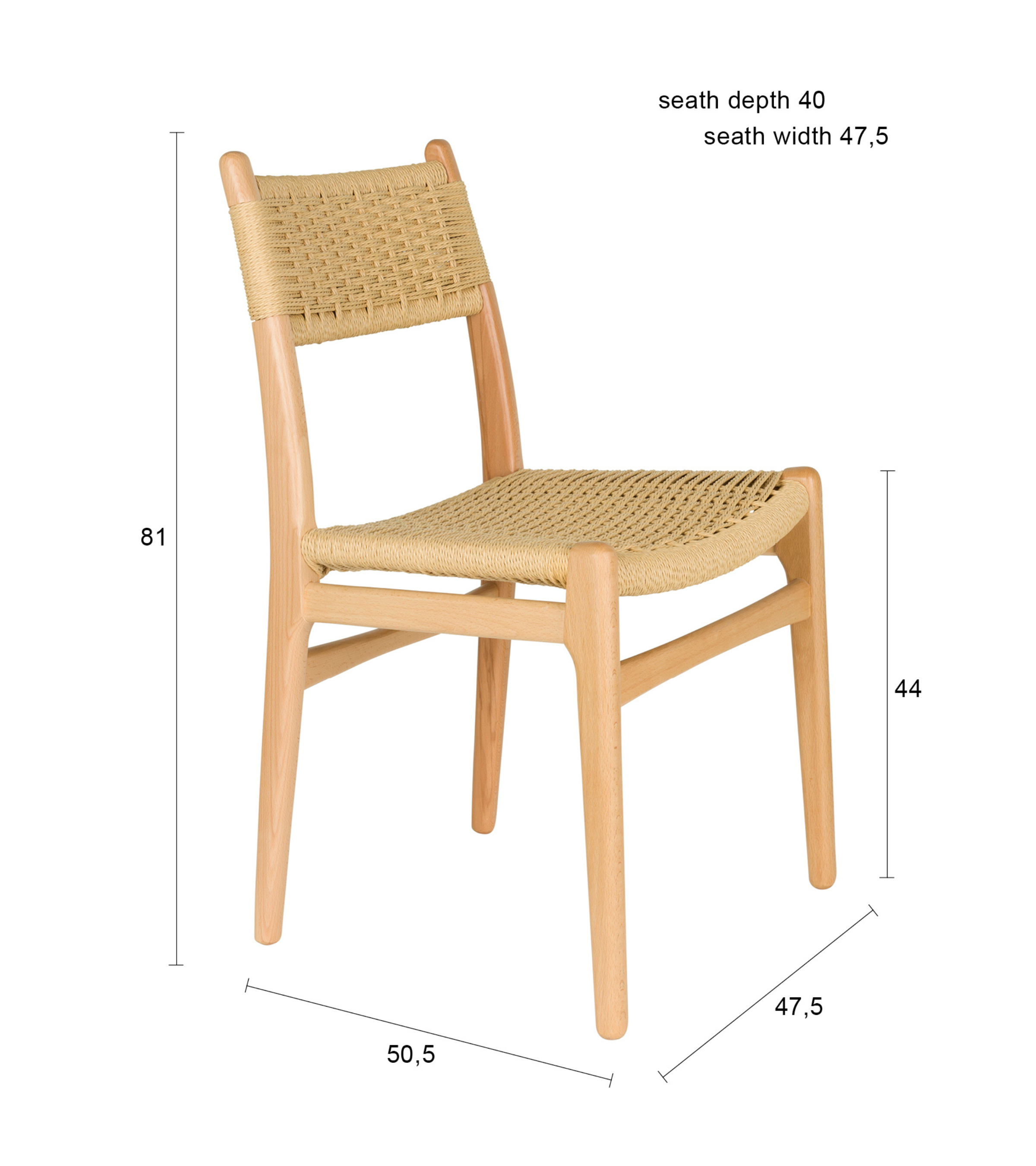 Stolička Cecile je poctou nadčasovému dizajnu a jednoduchosti inšpirovanej škandinávskym a japandi štýlom. Vďaka prírodným materiálom a ručne pletenému sedadlu z papierového povrazu, tento kus nábytku prináša do interiéru útulnosť, autenticitu a vizuálnu ľahkosť. Štíhla konštrukcia z bukového dreva zabezpečuje stabilitu a trvácnosť, a jemný béžový odtieň sa skvele hodí k svetlým, prírodným aranžmánom.