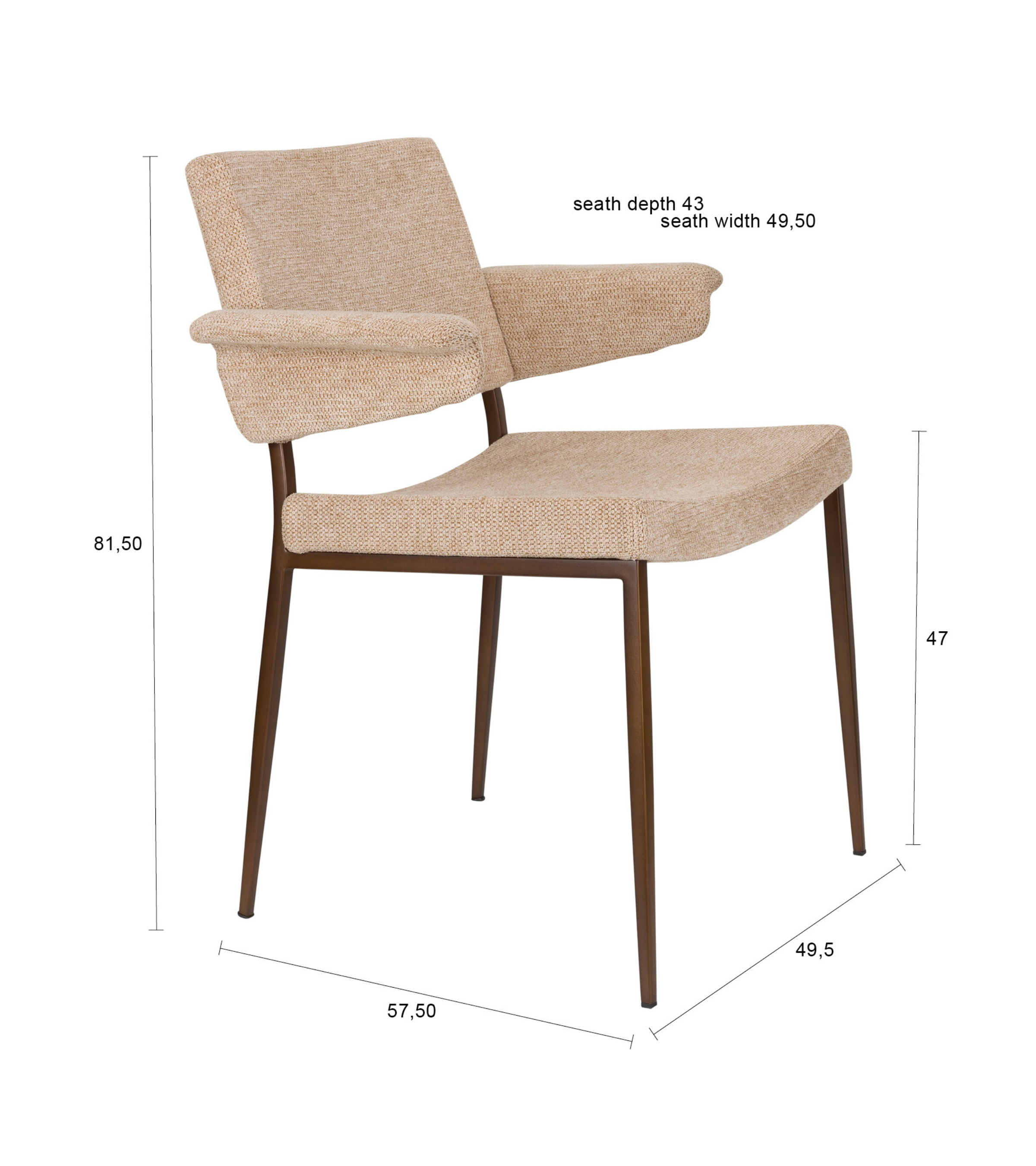 Vytvorte útulnú atmosféru v jedálni s stoličkou Portland, ktorá nás prenáša do atmosférických interiérov 50. rokov. Už na prvý pohľad upúta pozornosť operadlo so subtílne zakrivenými podrúčkami, pripomínajúcimi tvarom krídla. Jemne tvarované sedadlo zabezpečuje vysoký komfort aj počas dlhých, večerných rozhovorov pri stole. Hrubo tkaná, béžová poťahová látka vnáša prirodzené teplo, čím vytvára pôsobivý kontrast s kovovým rámom v hnedej, patinovanej úprave.