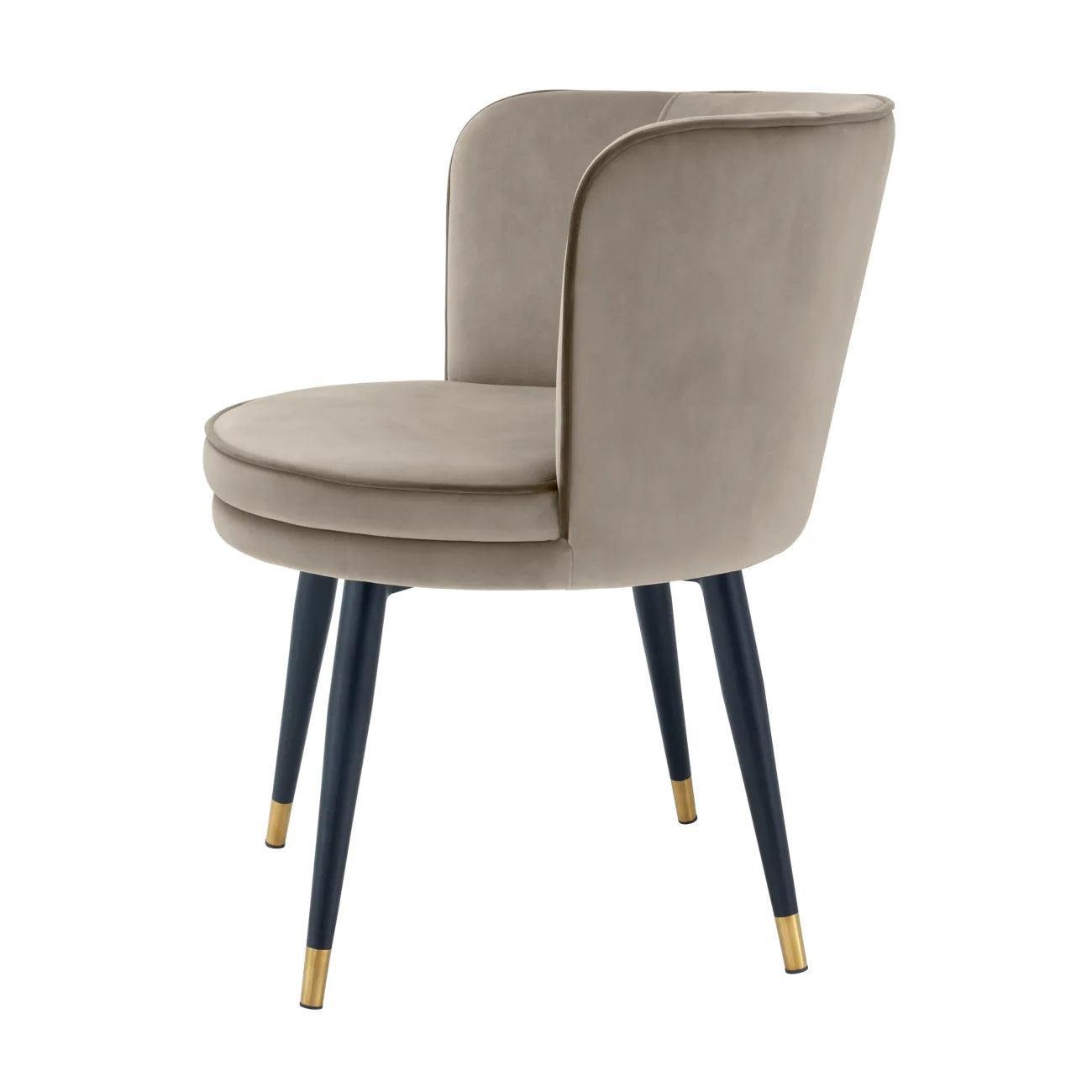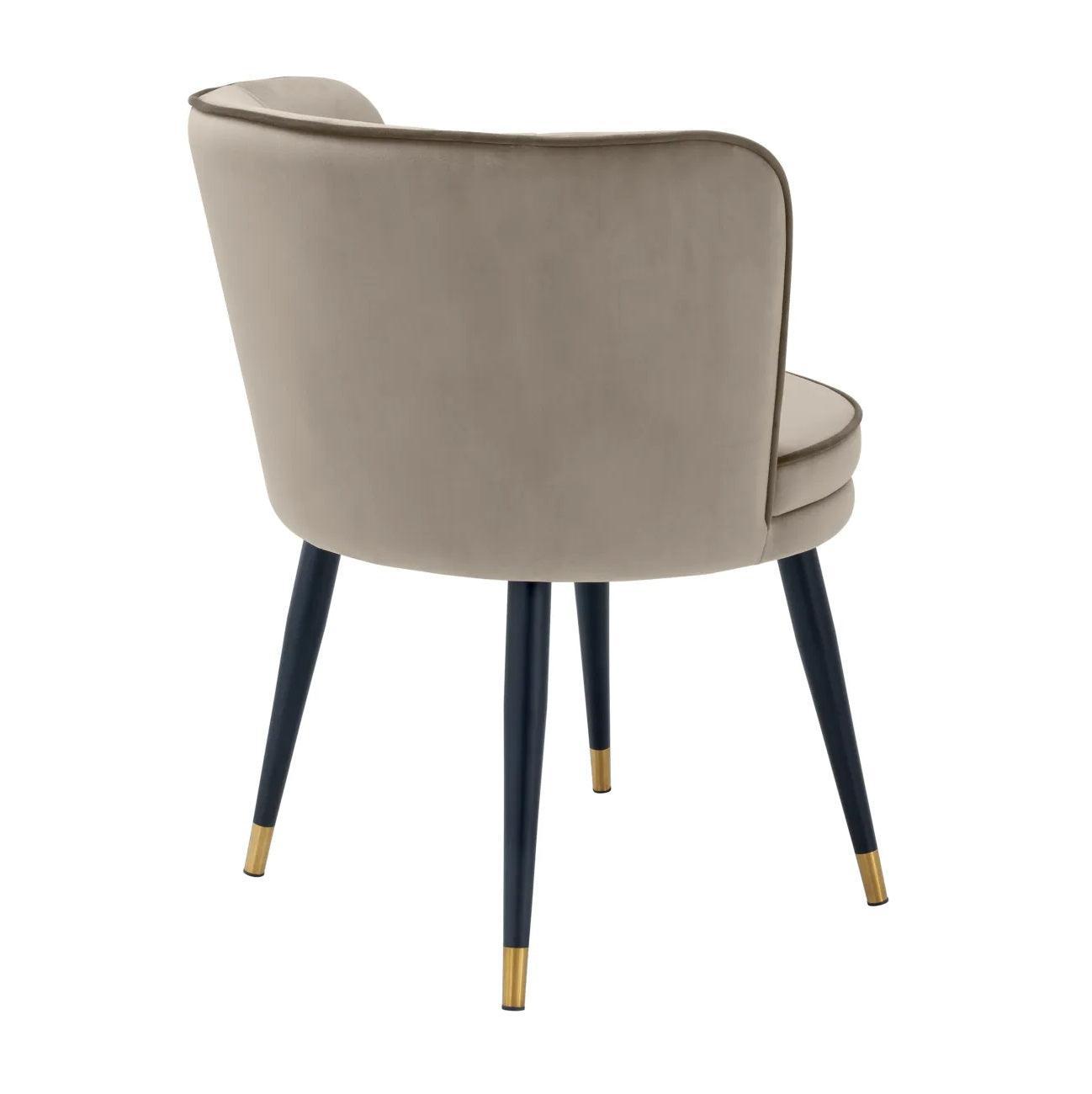 Jedným z prvých prvkov, ktoré upútajú pozornosť, sú jeho čierne zúžené nohy. To je jemné odkazovanie na klasický dizajn, ktoré dodáva celej stoličke eleganciu. Navyše, nohy sú ozdobené zlatými krytkami, ktoré im dodávajú výnimočný lesk a luxusné dokončenie. Táto stolička určite pritiahne pozornosť každého hosťa.