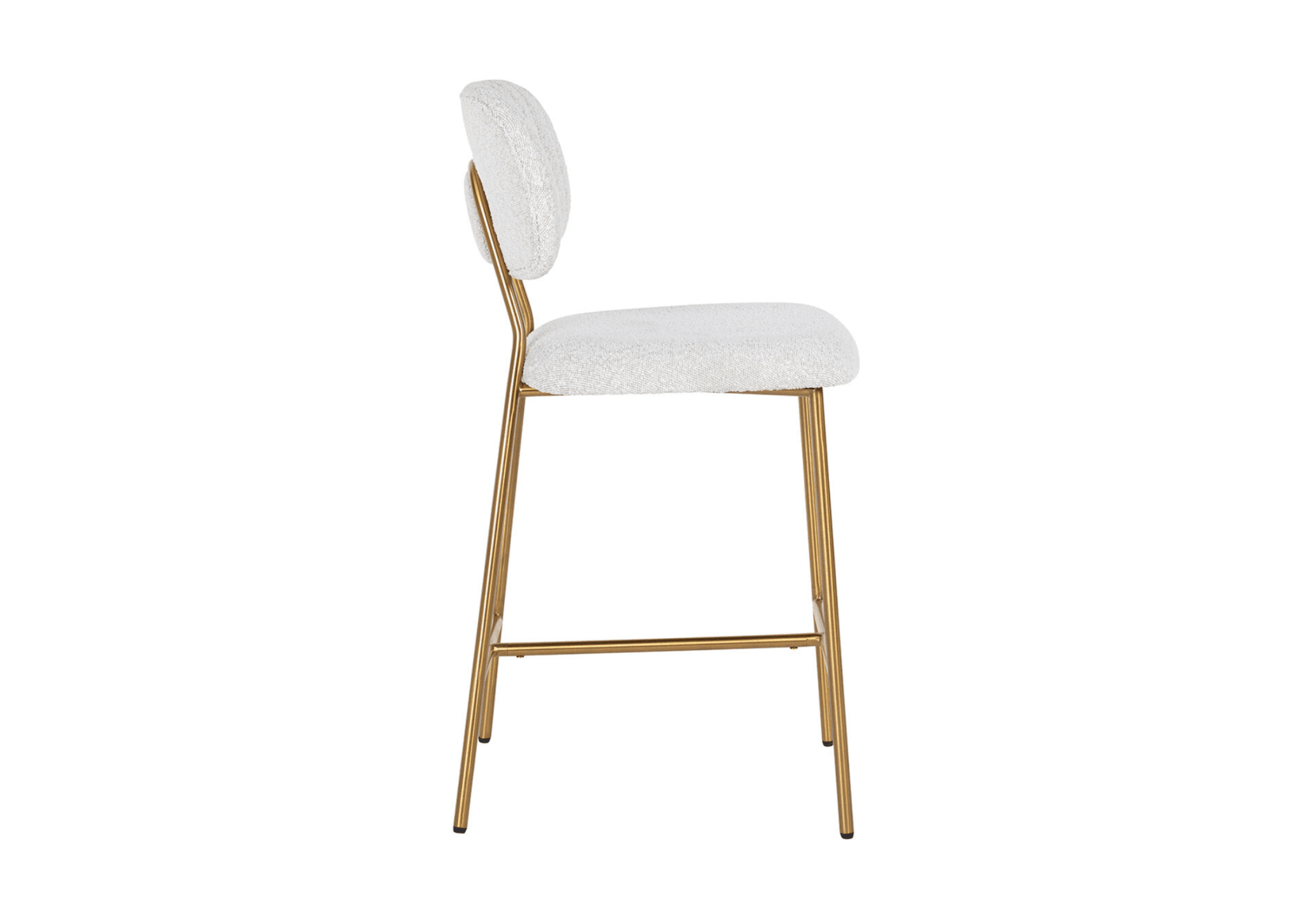 Barová stolička Xenia je výnimočný kus nábytku, ktorý pritiahne pozornosť všetkých milovníkov štýlu glamour. Jej charakteristické operadlo, ozdobené výraznými prešívaniami, a čalúnenie sedadla vyrobené z elegantnej tkaniny typu bouclé v bielej farbe mu dodávajú neuveriteľný pôvab.