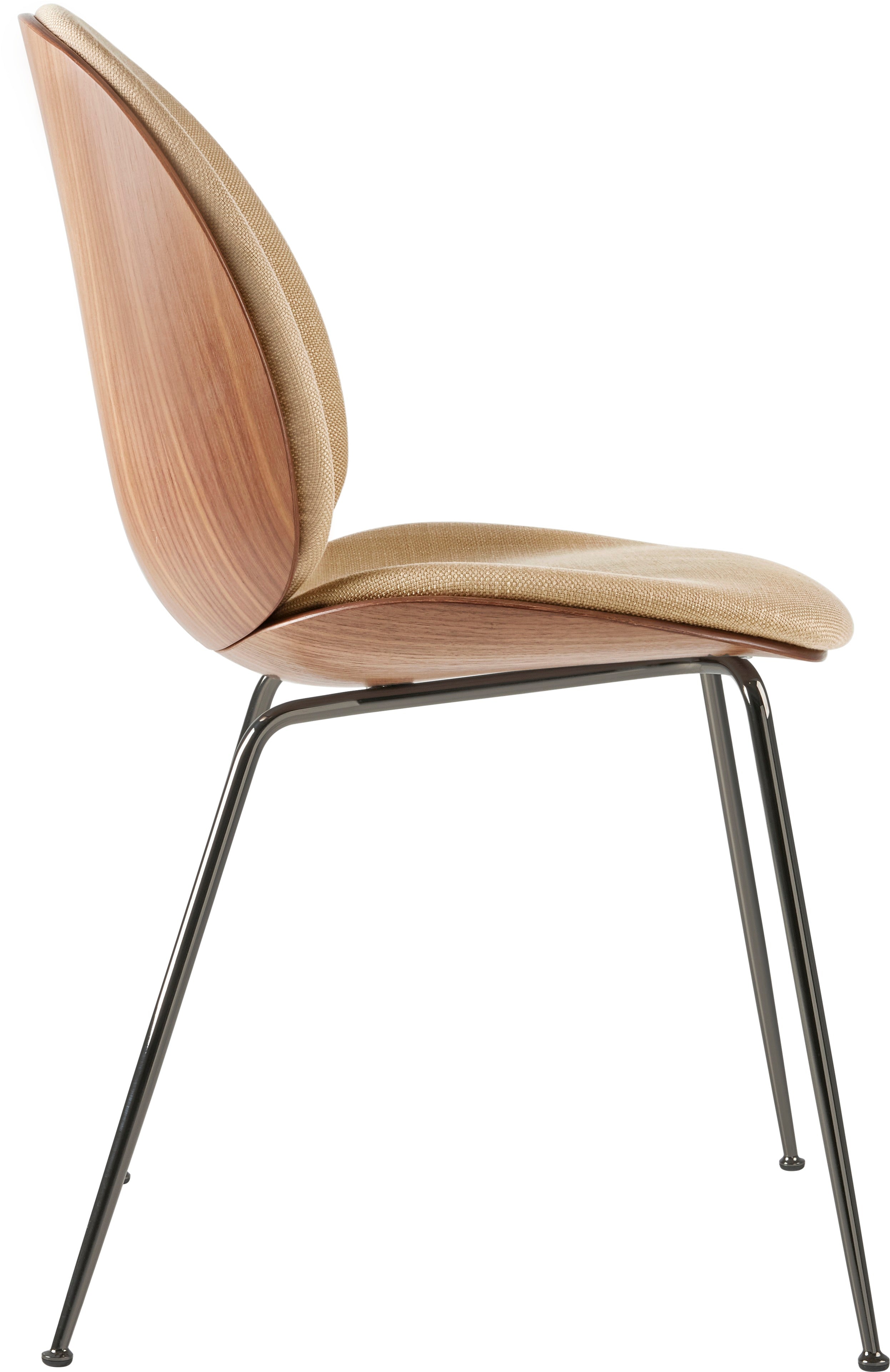 Krzesło BEETLE tapicerowane z drewnem orzechowym i czarną chromowaną podstawą