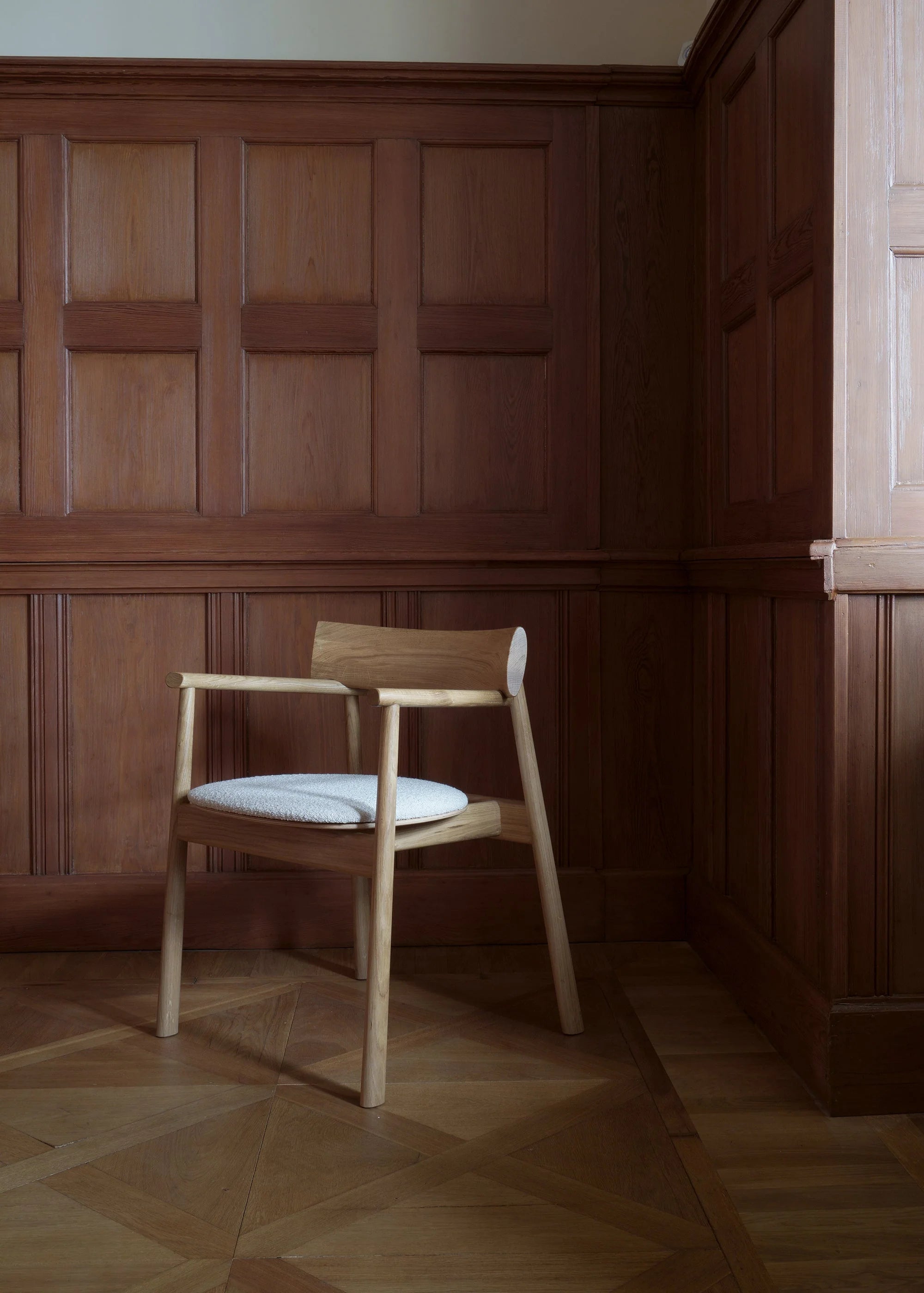 Stolička Elipsa Soft je rozšírením myšlienky plynulej, organickej formy, obohatenej o mäkké, čalúnené sedadlo z tkaniny boucle. Harmonické proporcie a eliptické línie sa tu stretávajú s útulným komfortom, vytvárajúc nábytok, ktorý spája estetiku remeselného dizajnu s funkčnosťou každodenného používania. Subtílne naklonené opierky rúk a presne tvarované operadlo podporujú telo, zatiaľ čo mäkké čalúnenie vyzýva k dlhému sedenia.