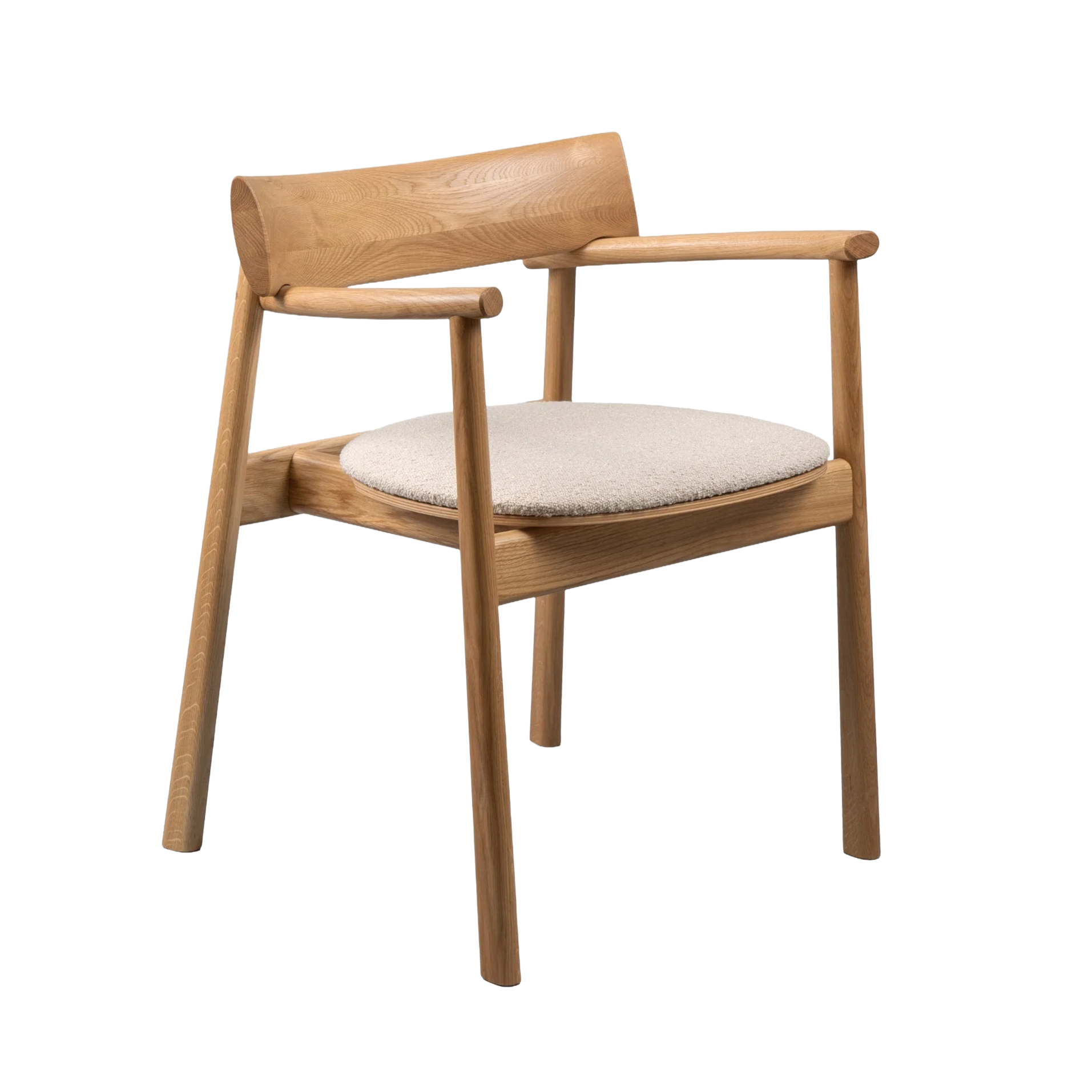 Stolička Elipsa Soft je rozšírením myšlienky plynulej, organickej formy, obohatenej o mäkké, čalúnené sedadlo z tkaniny boucle. Harmonické proporcie a eliptické línie sa tu stretávajú s útulným komfortom, vytvárajúc nábytok, ktorý spája estetiku remeselného dizajnu s funkčnosťou každodenného používania. Subtílne naklonené opierky rúk a presne tvarované operadlo podporujú telo, zatiaľ čo mäkké čalúnenie vyzýva k dlhému sedenia.