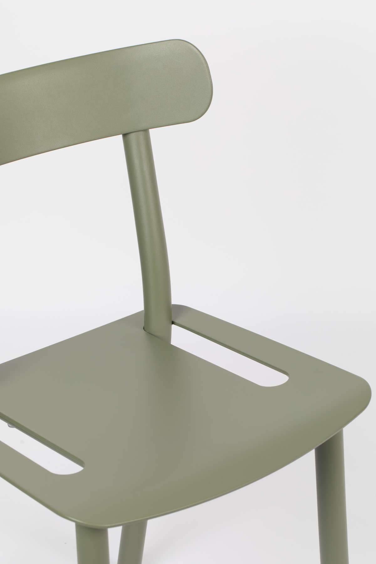 Zadné nohy, plynulo prechádzajúce cez sedadlo, dodávajú stoličke neopakovaný výzor a uľahčujú skladovanie, vďaka možnosti ich stohovania. Hliník, z ktorého je stolička vyrobená, je vhodný na použitie vnútri aj na vonku budovy. Použité zátky, vyrobené z plastu, skrývajú všetky konštrukčné prvky.