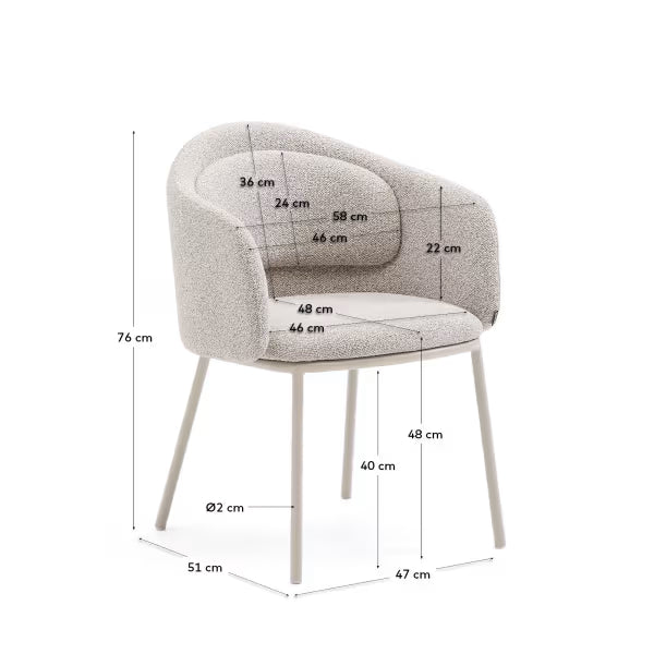 Stolička Idaira je elegantnou kombináciou komfortu, nadčasového dizajnu a vysokokvalitných materiálov. Čalúnenie vyrobené z béžovej šenilovej tkaniny s výraznou štruktúrou dodáva nábytku výnimočnú mäkkosť a útulný charakter, a zároveň zdôrazňuje jeho moderný štýl. Stabilné oceľové nohy s farebne zladeným povrchom tvoria súdržný a elegantný celok, vďaka čomu stolička dokonale vyniká pri stole v jedálni, v obývacej izbe alebo v komerčných priestoroch.
