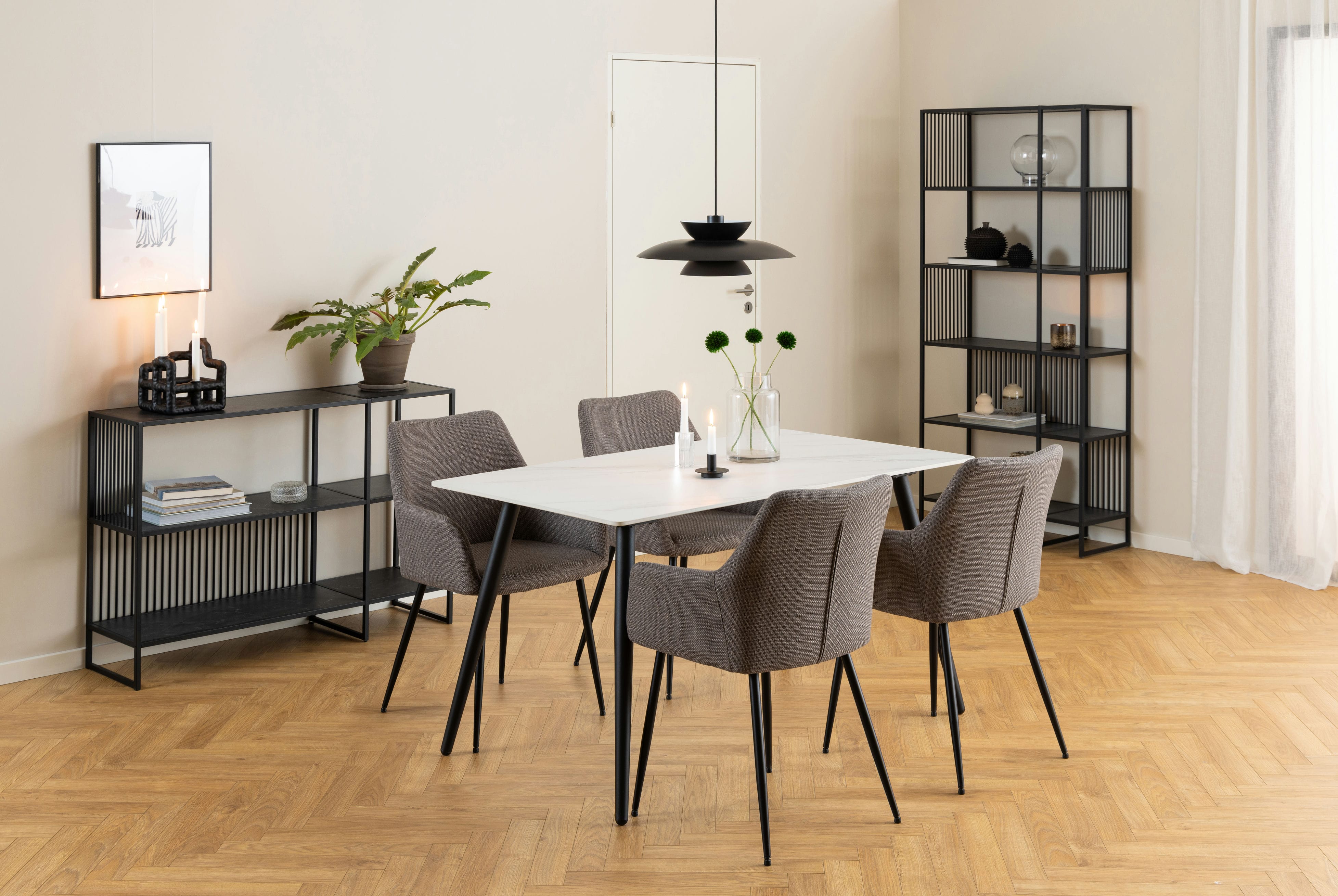 Czarne stalowe nogi dodają krzesłu wszechstronnego charakteru, dzięki czemu pasuje ono do wielu stylów aranżacji jadalni. Dodatkowy akcent stanowi zamek błyskawiczny, który umożliwia łatwe dostosowanie i konserwację.